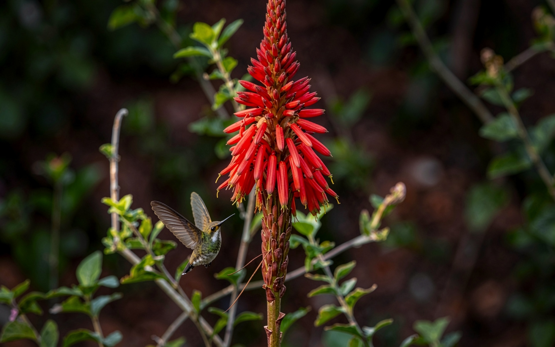 Колибри у полета возле красного цветка алоэ