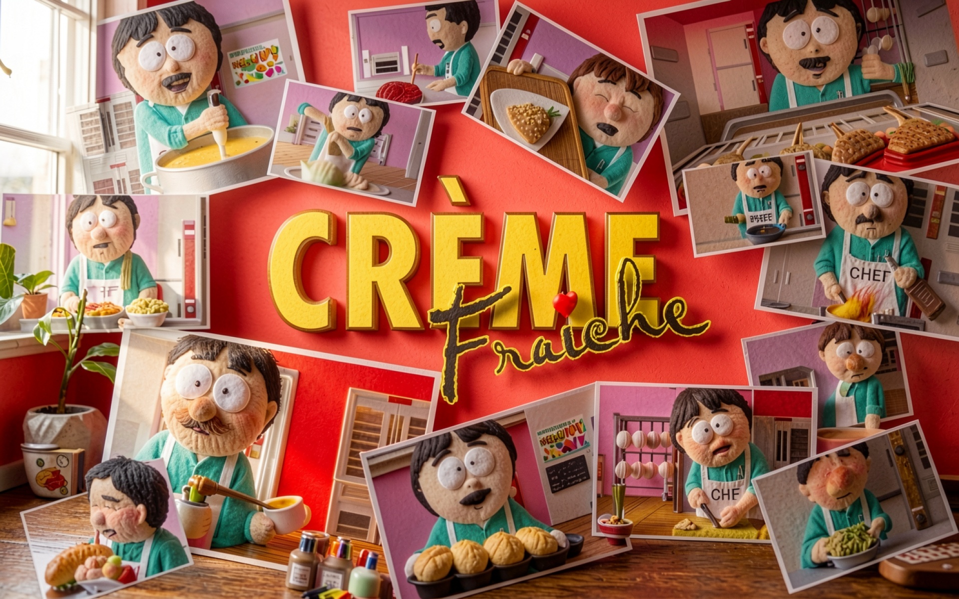 Коллаж повара в красном интерьере кухни