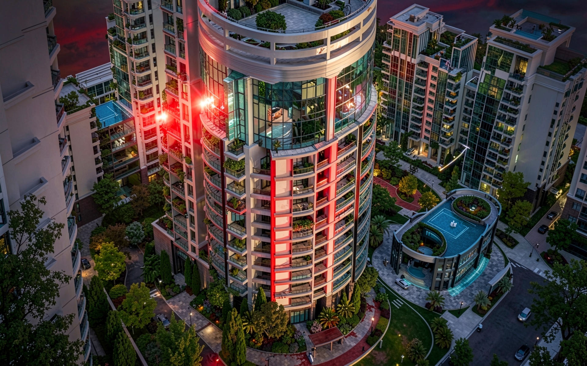Современный жилой комплекс с красной подсветкой вечером