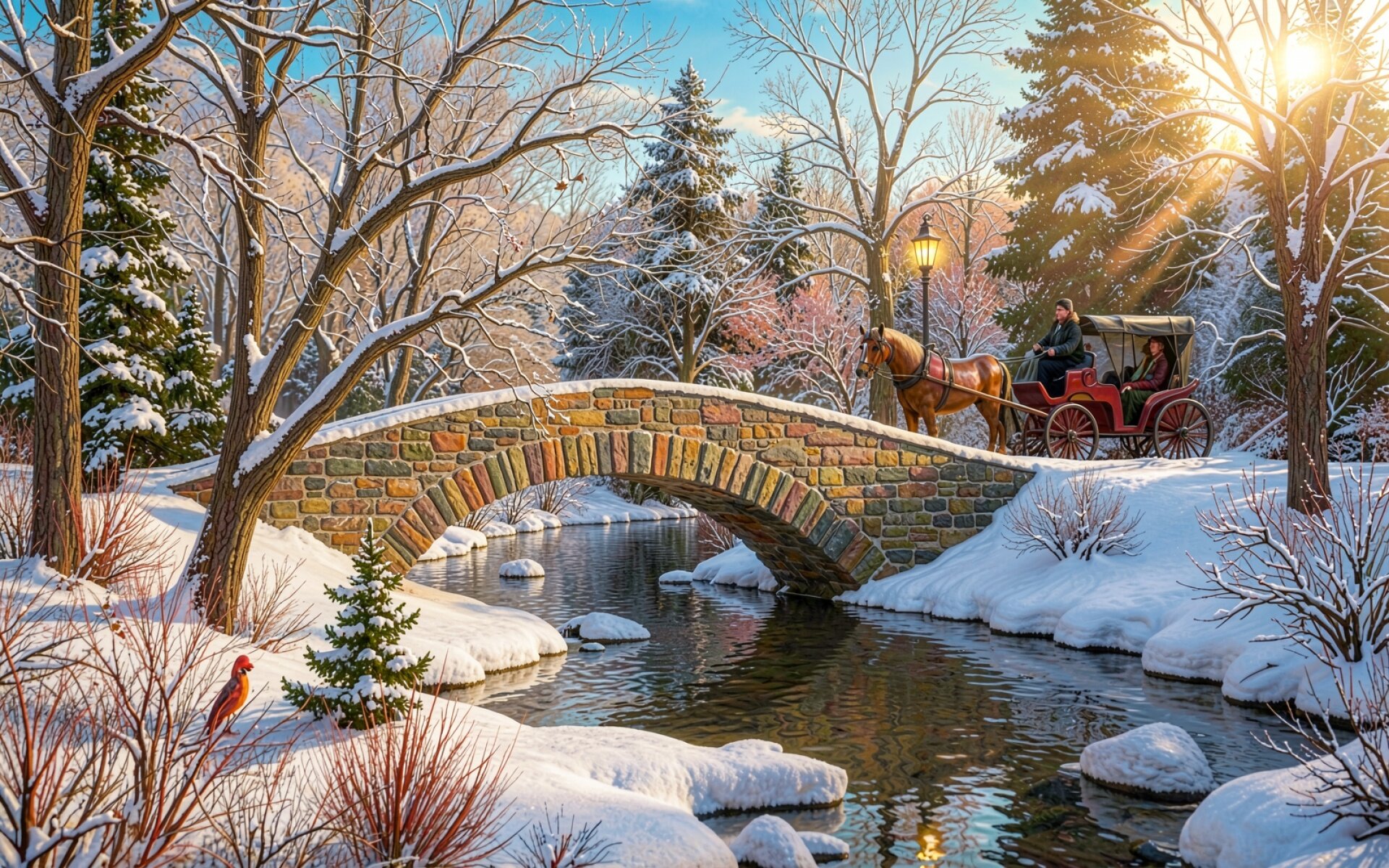 Зимний пейзаж каменный мост конная повозка