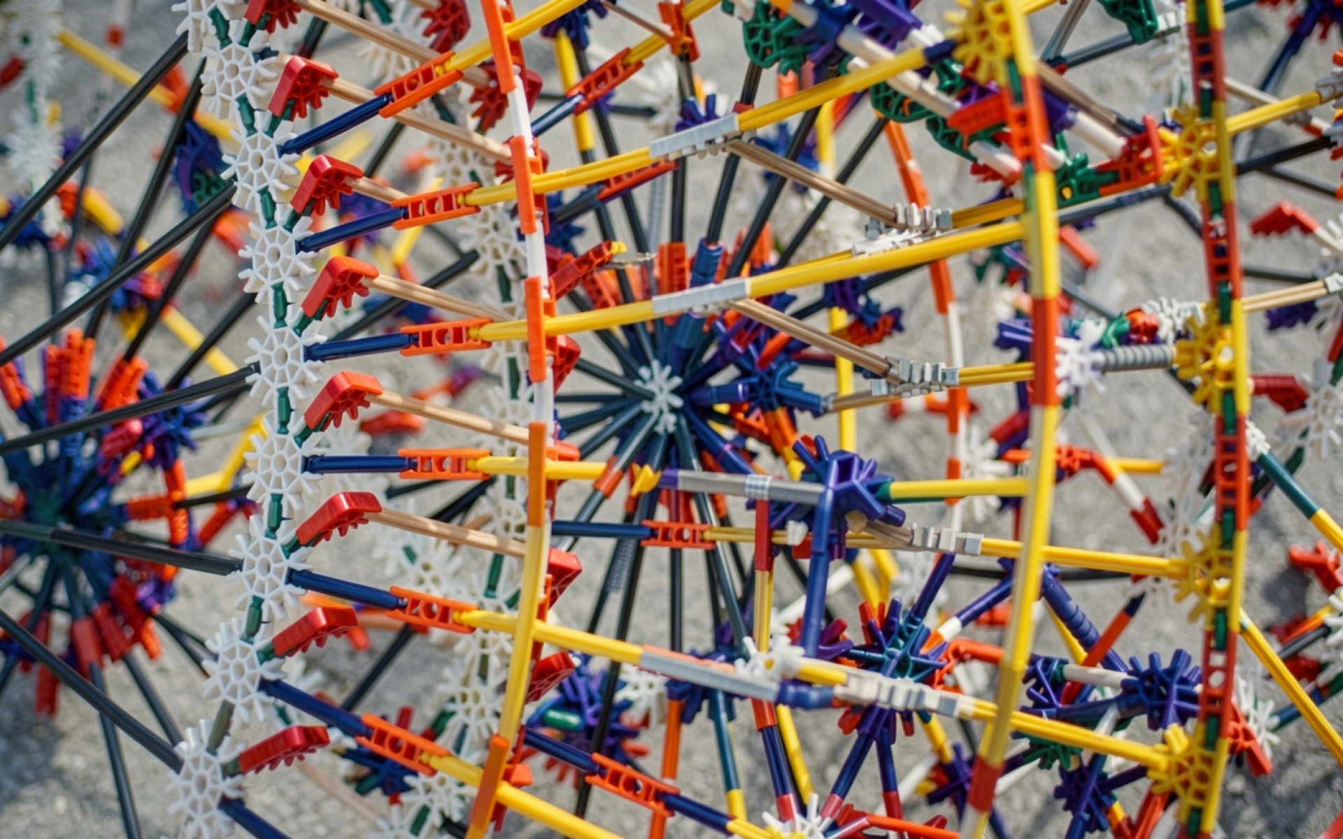 Конструктор из разноцветных пластиковых деталей на сером фоне