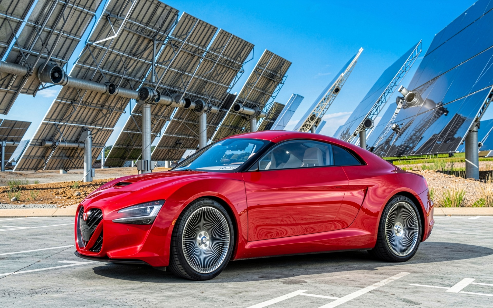Красный концепт-кар Alfa Romeo на фоне солнечных панелей