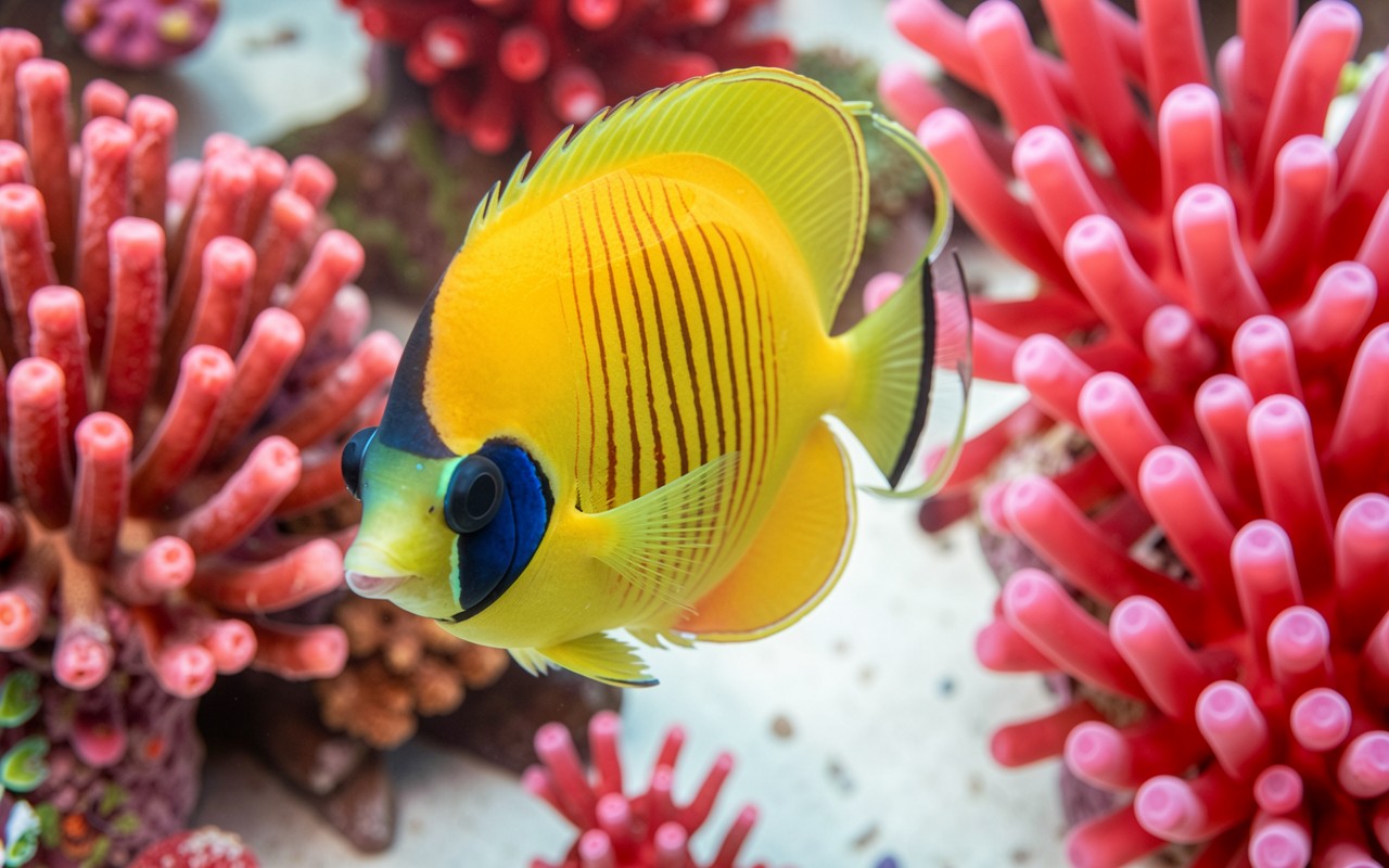 Желтая рыба-бабочка среди красных кораллов рифа