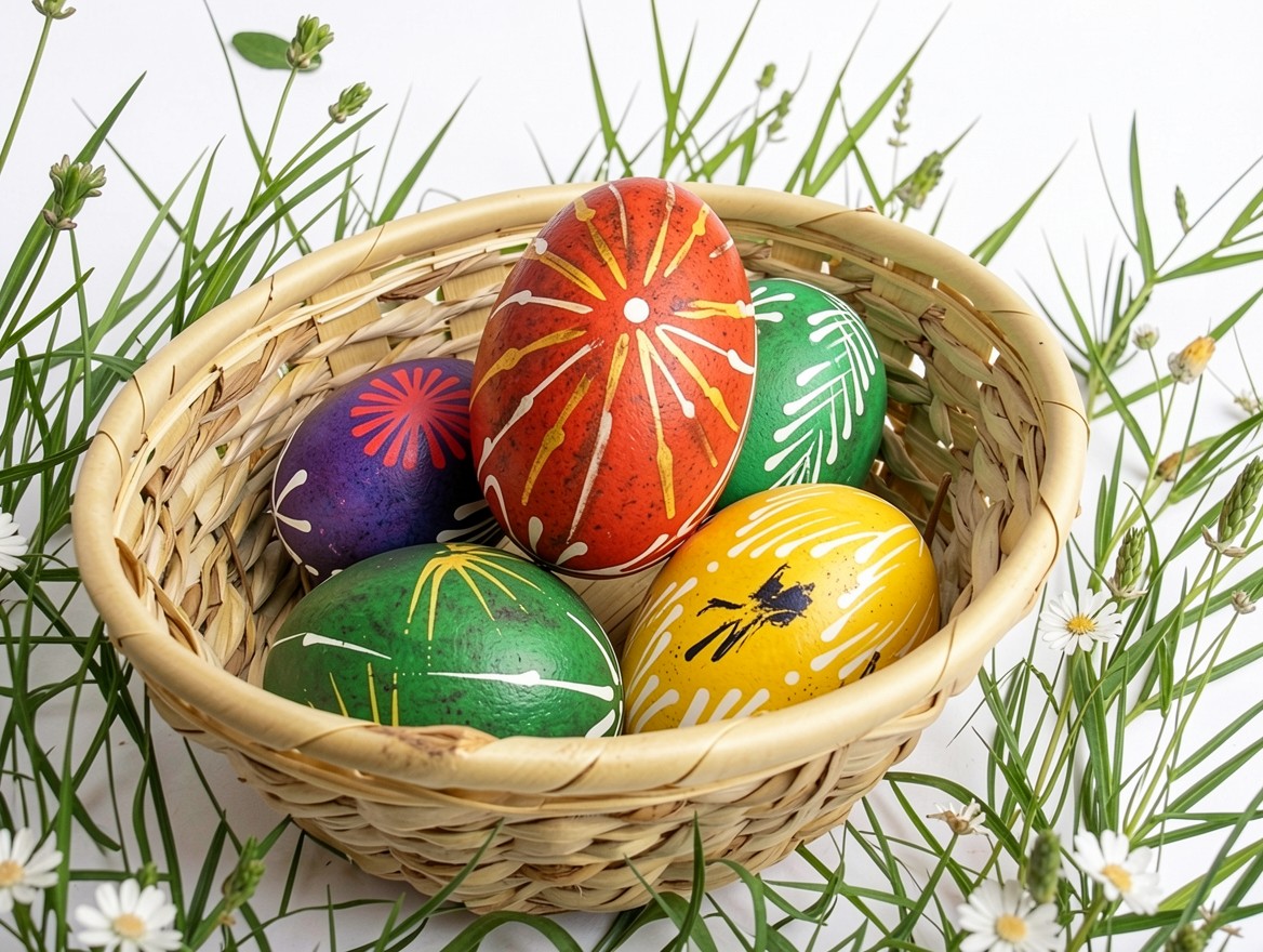 Разноцветные пасхальные яйца в плетеной корзине травы