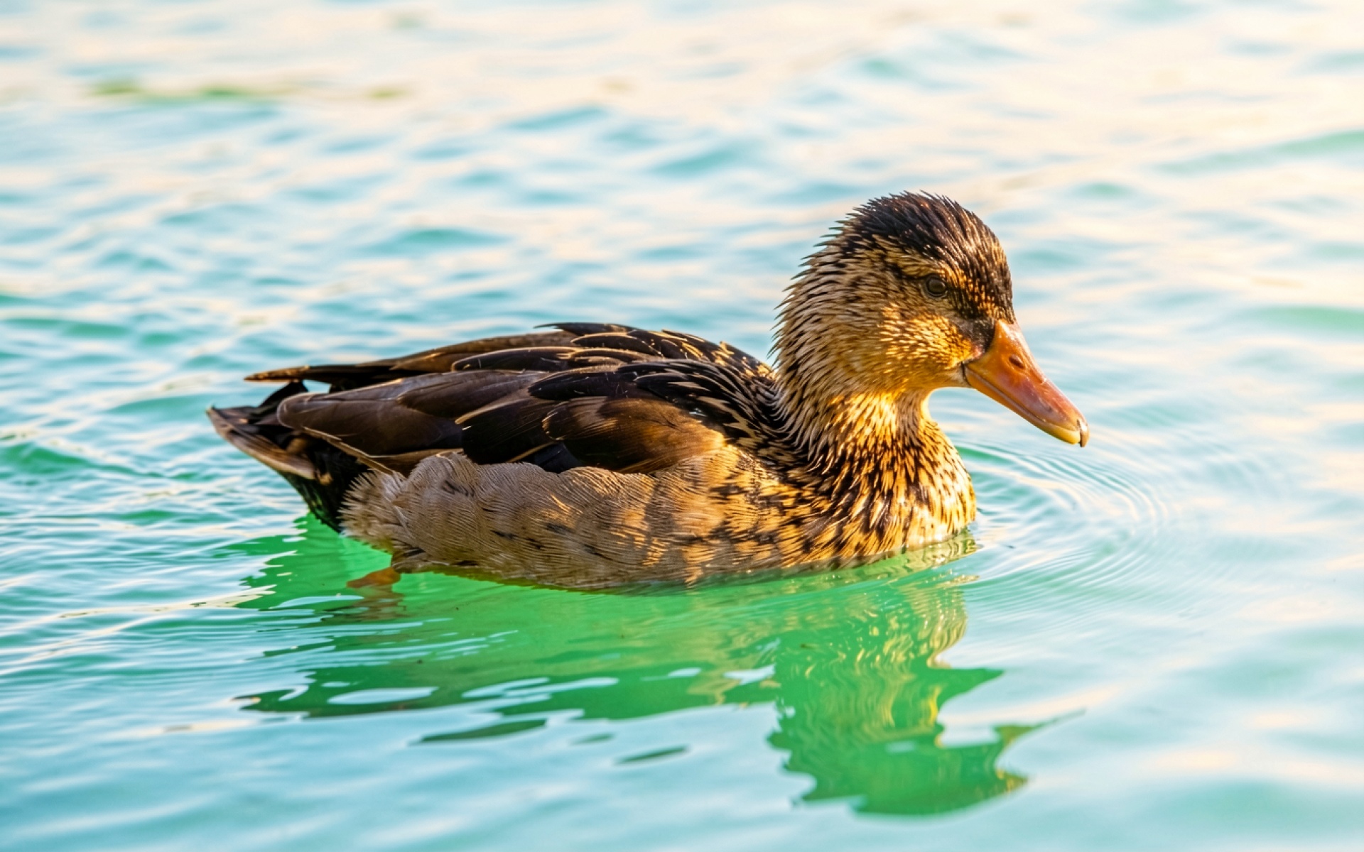 Коричневая утка в бирюзовой воде озера