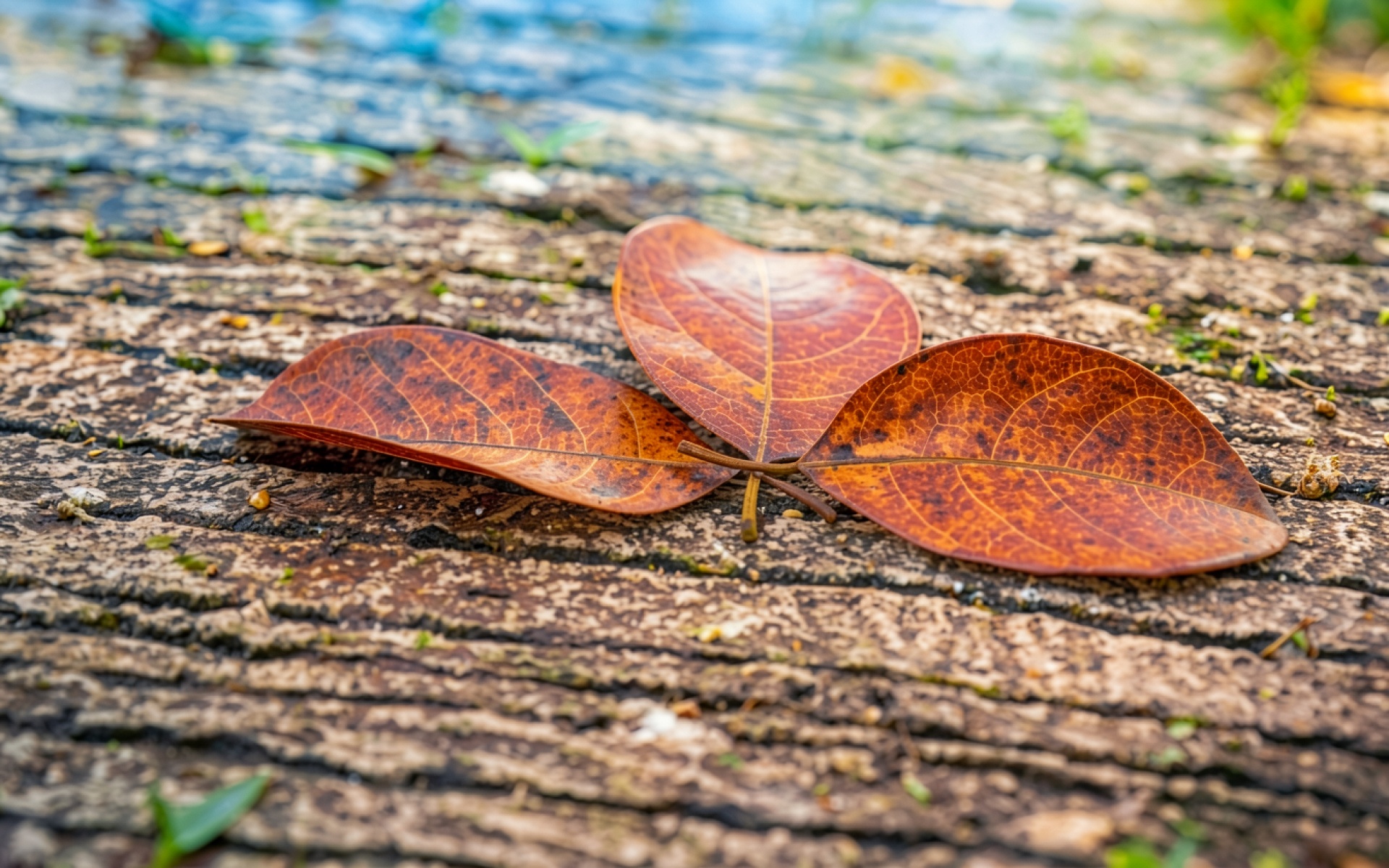 Три сухих коричневых листа на деревянном помосте