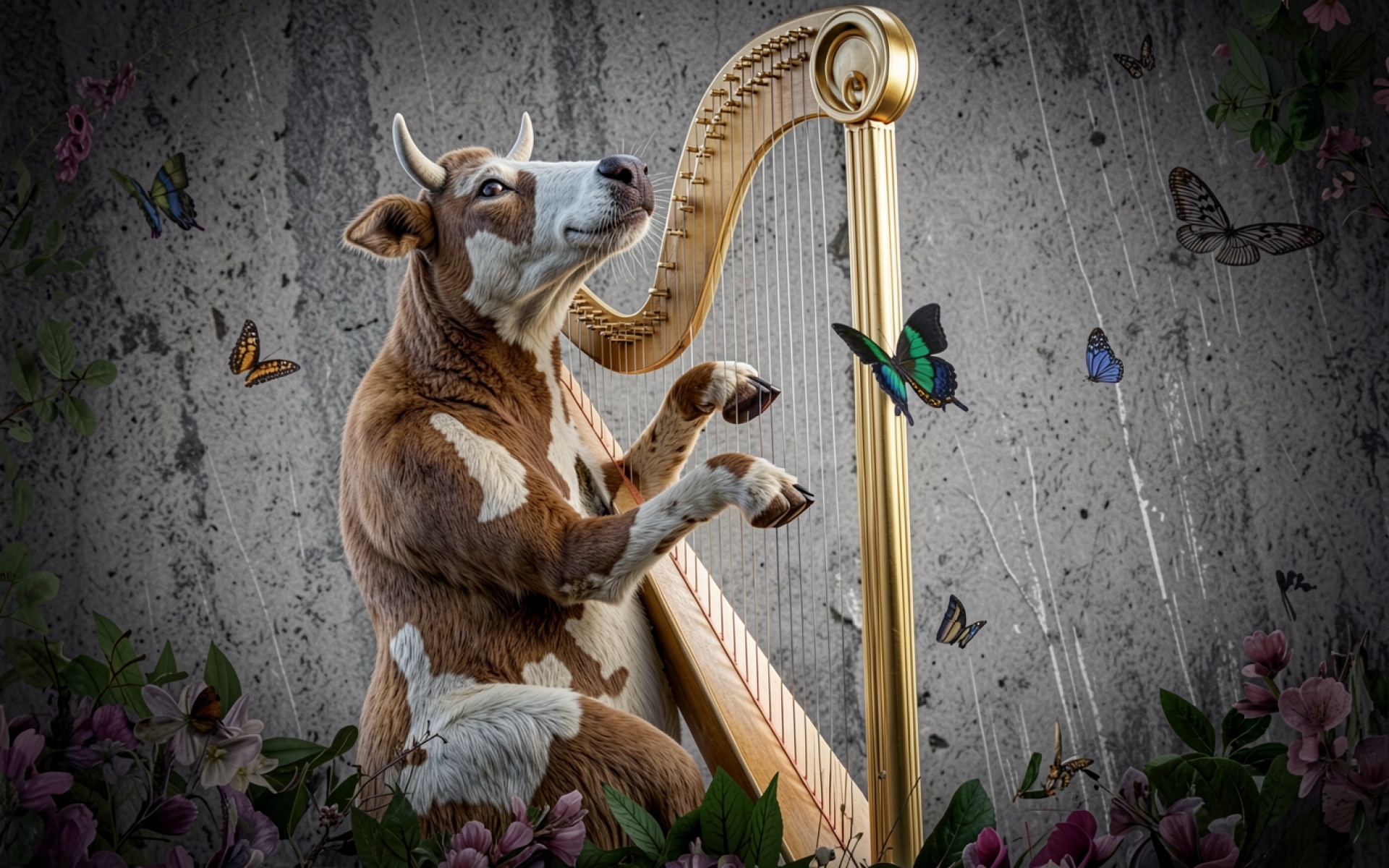 Корова играет на золотой арфе с бабочками