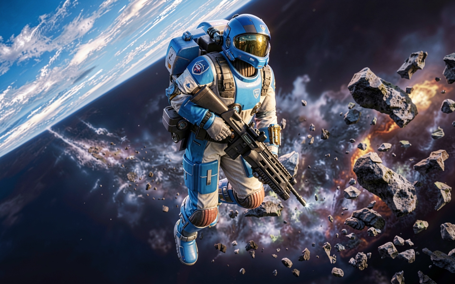 Космонавт в синем скафандре среди астероидов