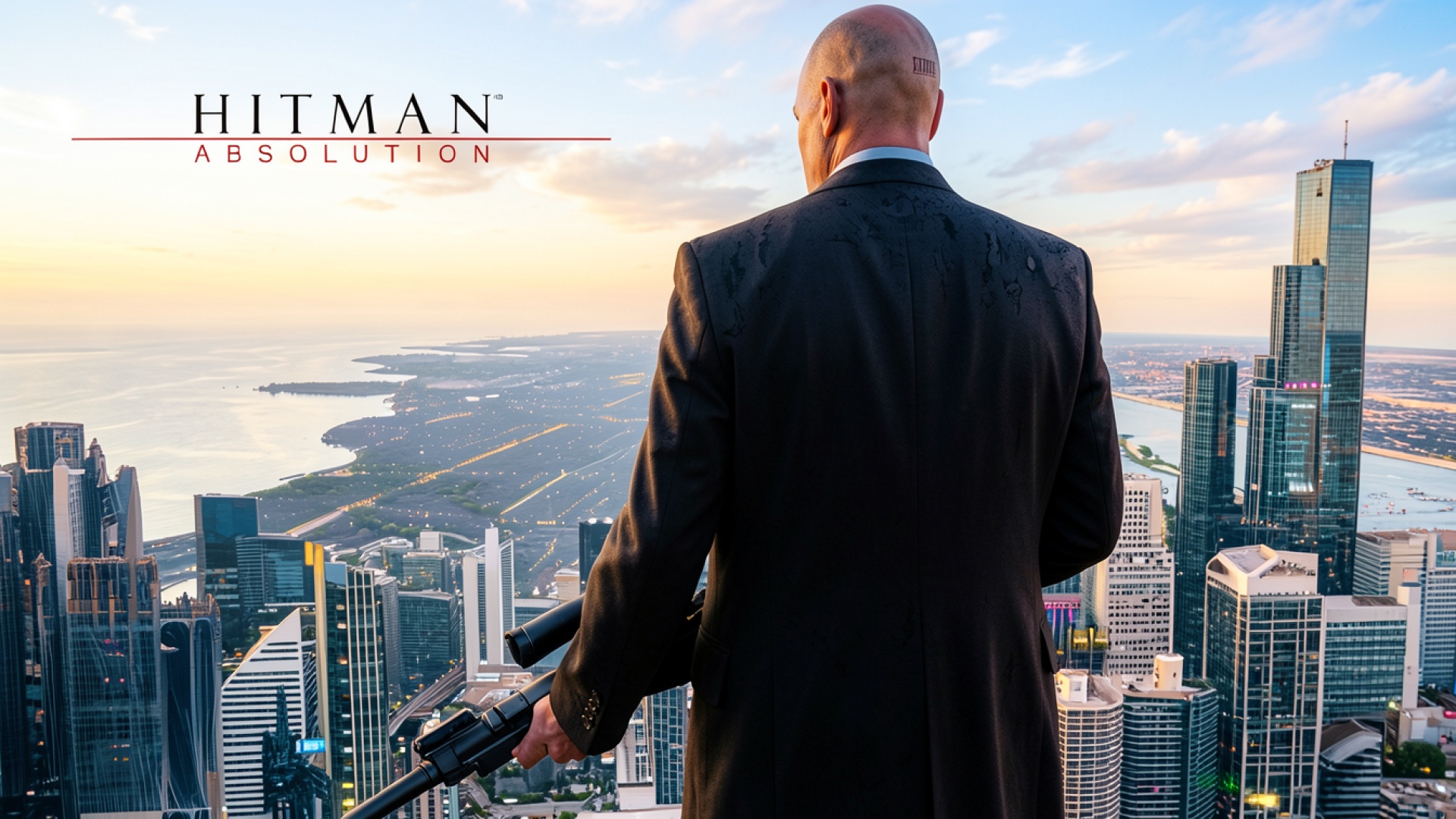 Агент 47 в черном костюме на крыше небоскреба