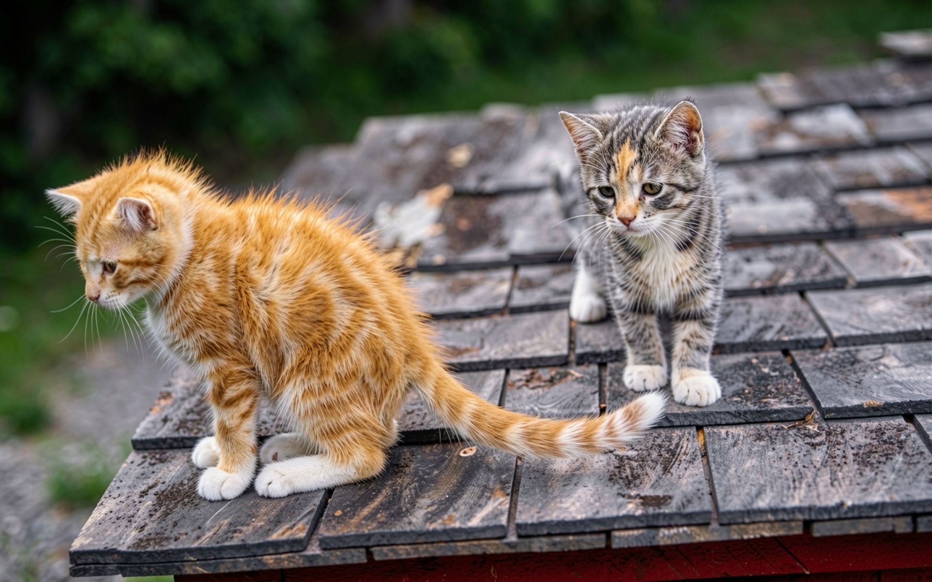 Два рыжий и серый котенка на крыше