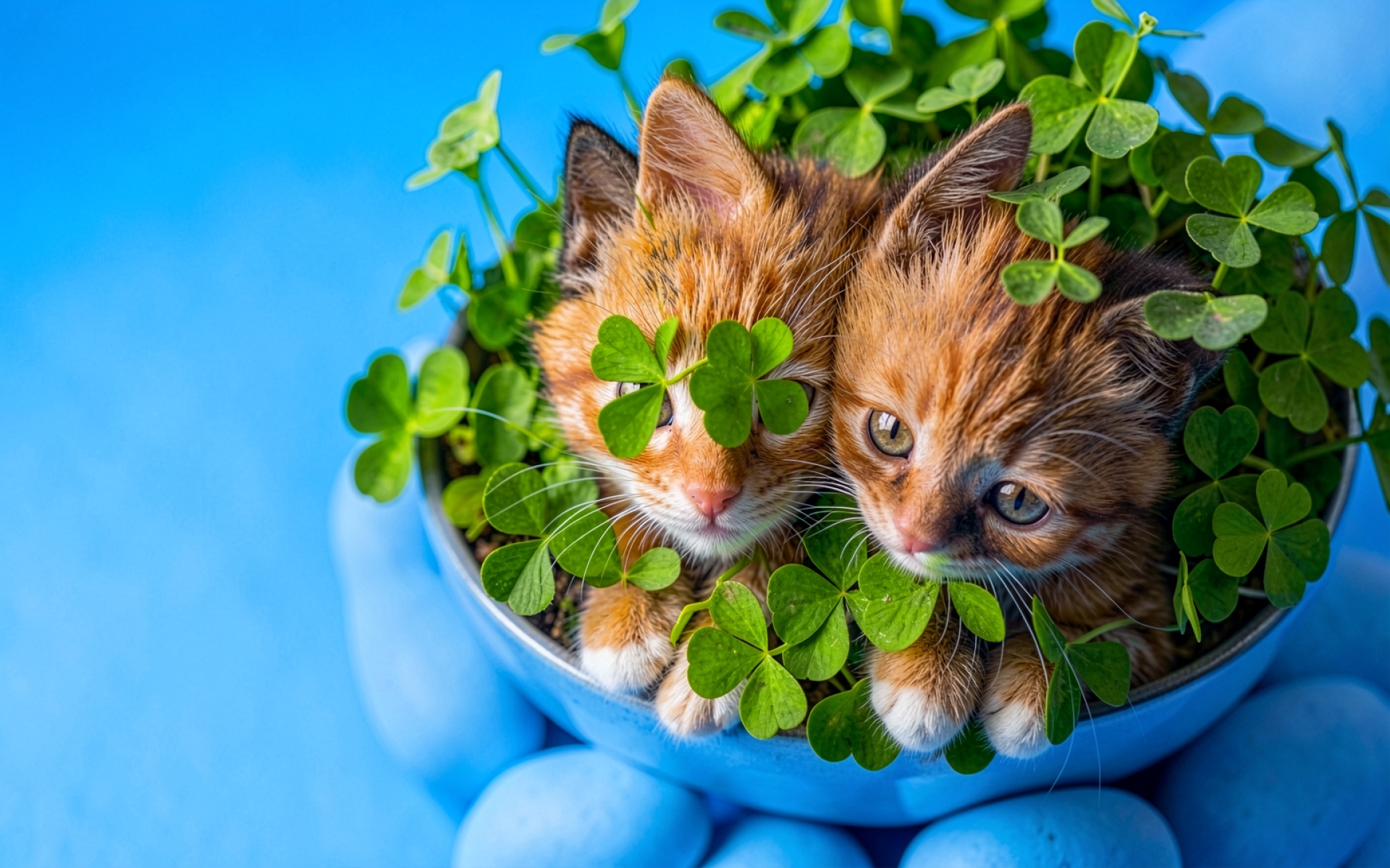 Два рыжих котенка в миске с клевером