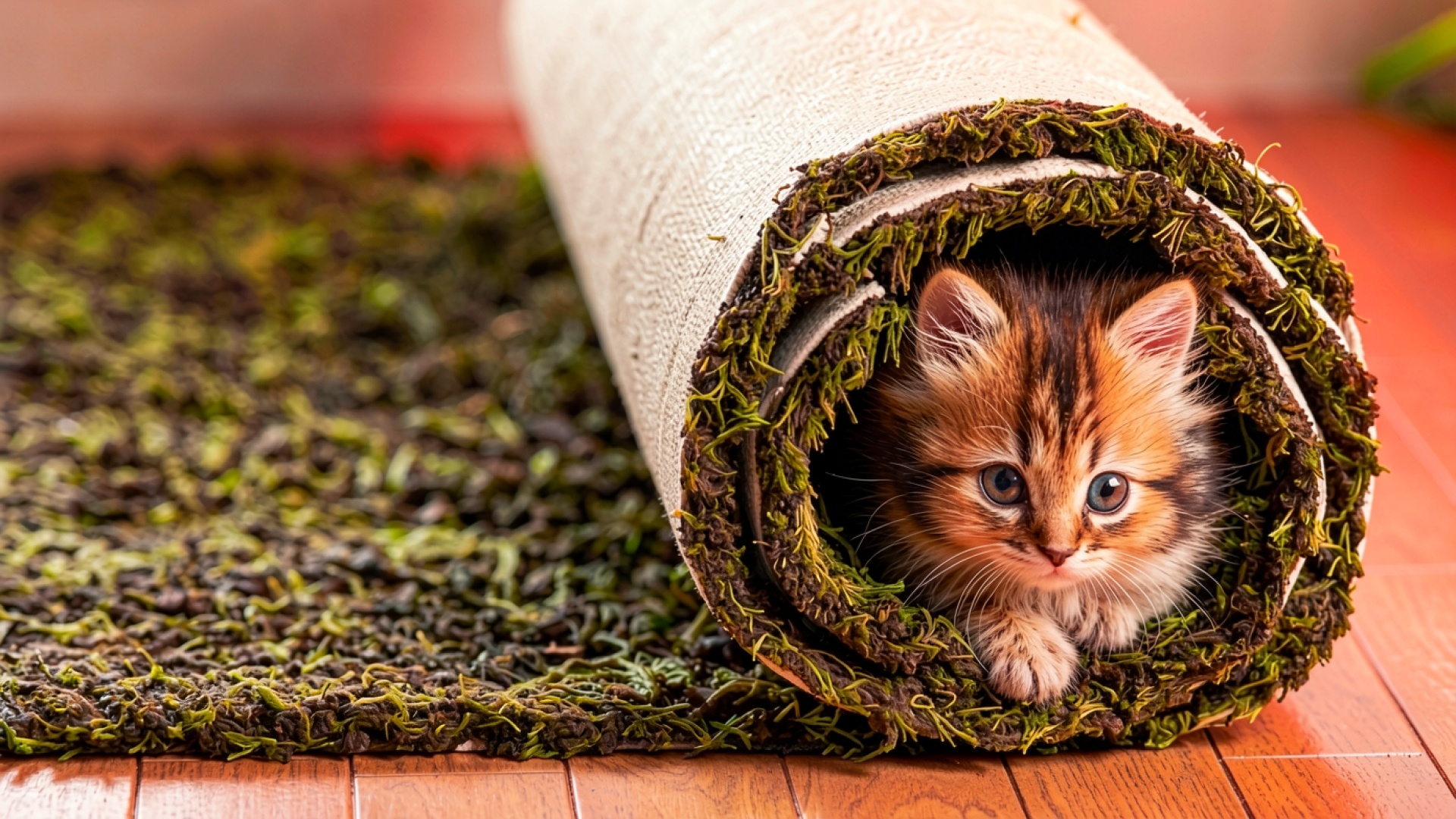 Рыжий котенок внутри свернутого зеленого ковра