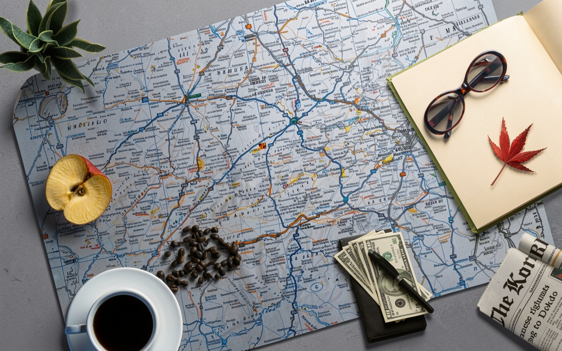 Старая дорожная карта с кофе и деньгами