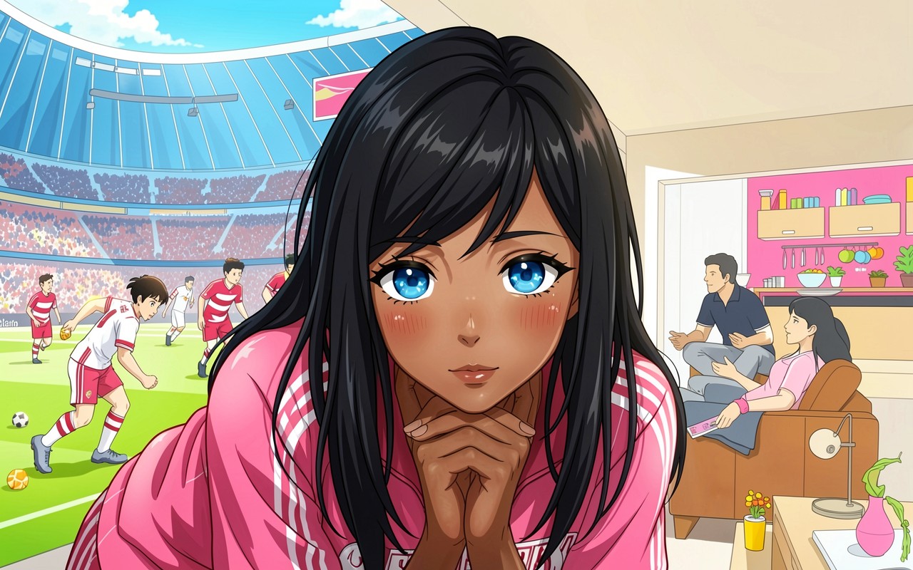 Аниме девушка в розовой кофте на стадионе
