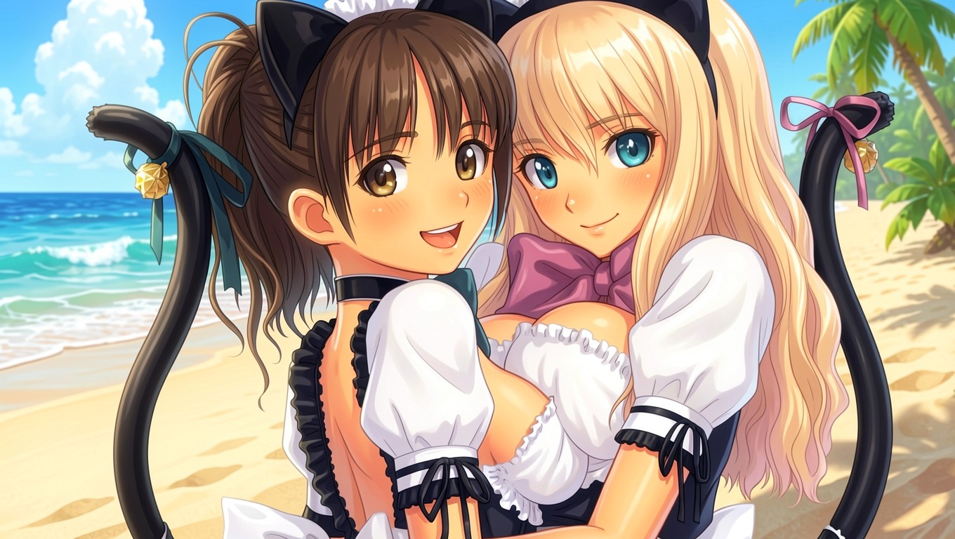 Две девушки кошки в горничных на пляже