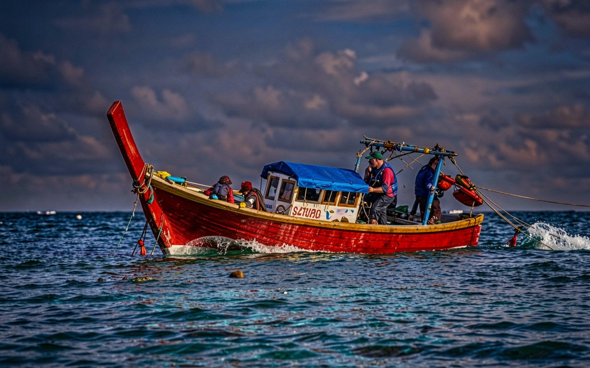 Красная рыбацкая лодка в синем океане