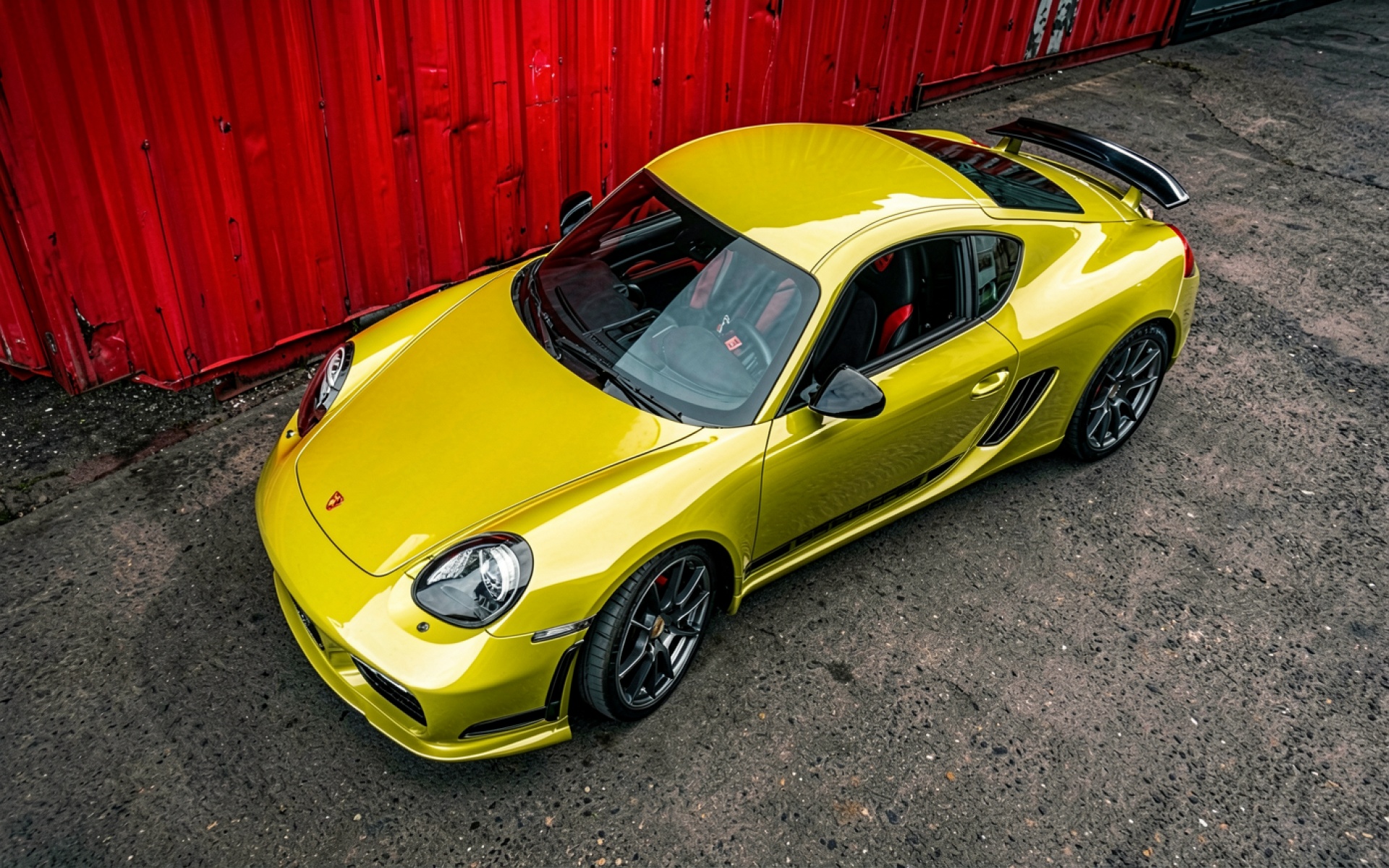 Желтый спортивный автомобиль Porsche на фоне красного контейнера