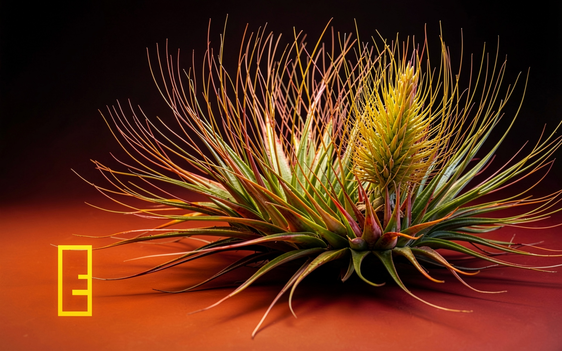 Растение тилландсия красного цвета в темном интерьере
