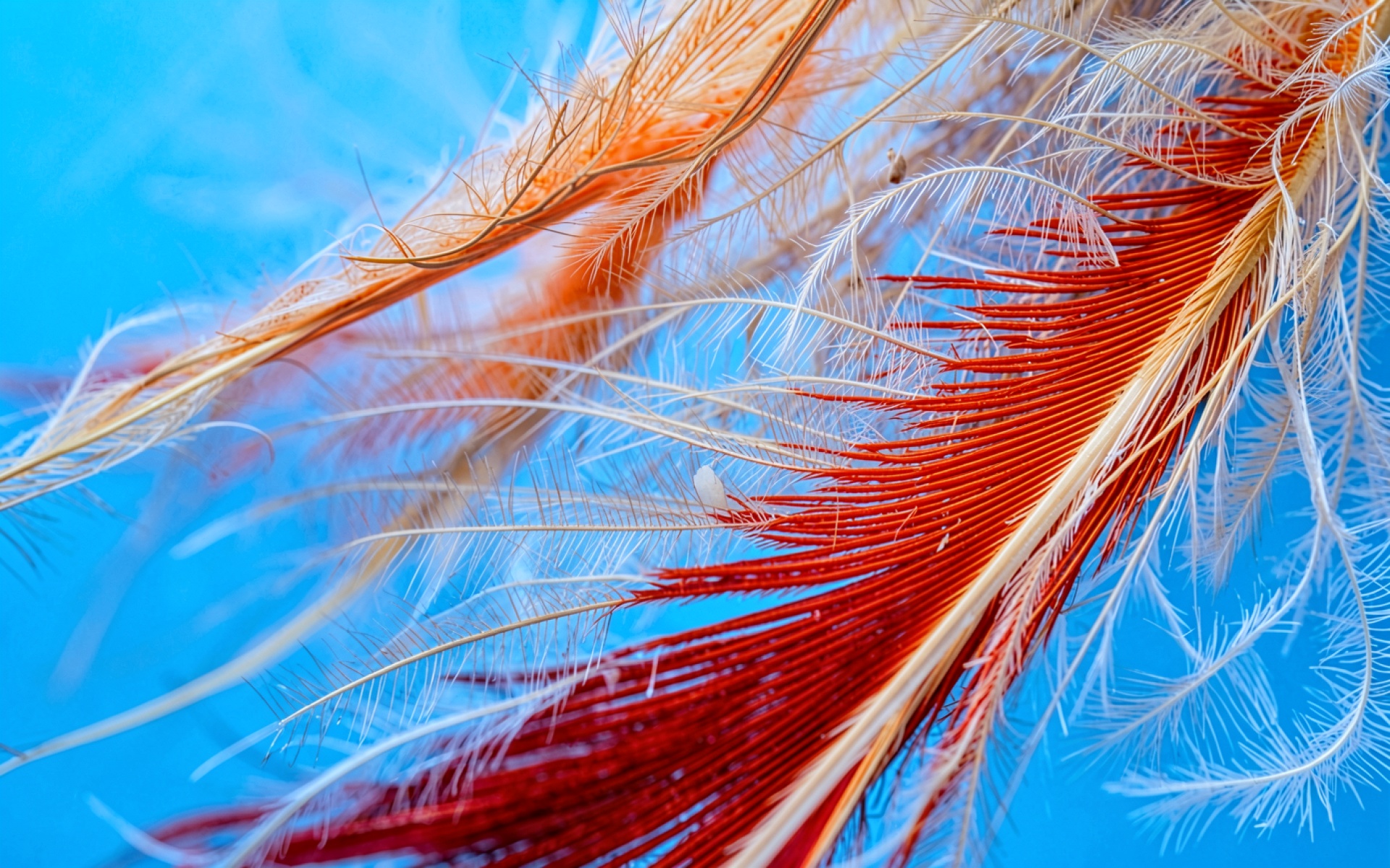 Красное перо на ярко-голубом фоне макро