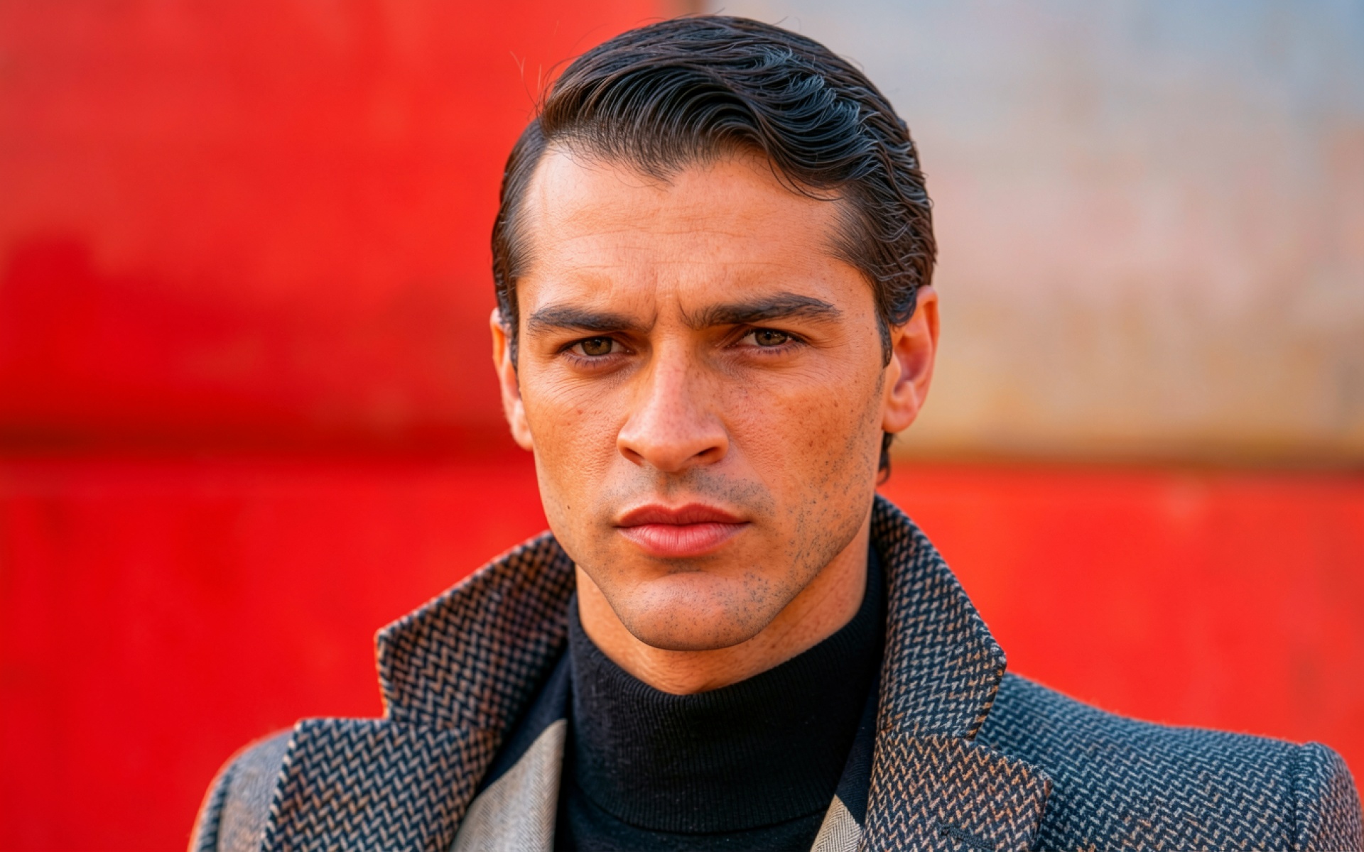 Мужчина в сером пальто на красном фоне