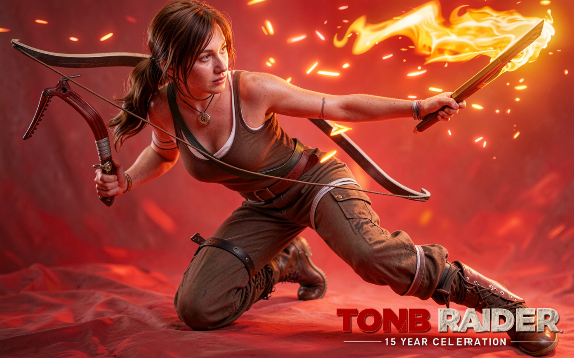 Лара Крофт с огненным мечом в красном окружении