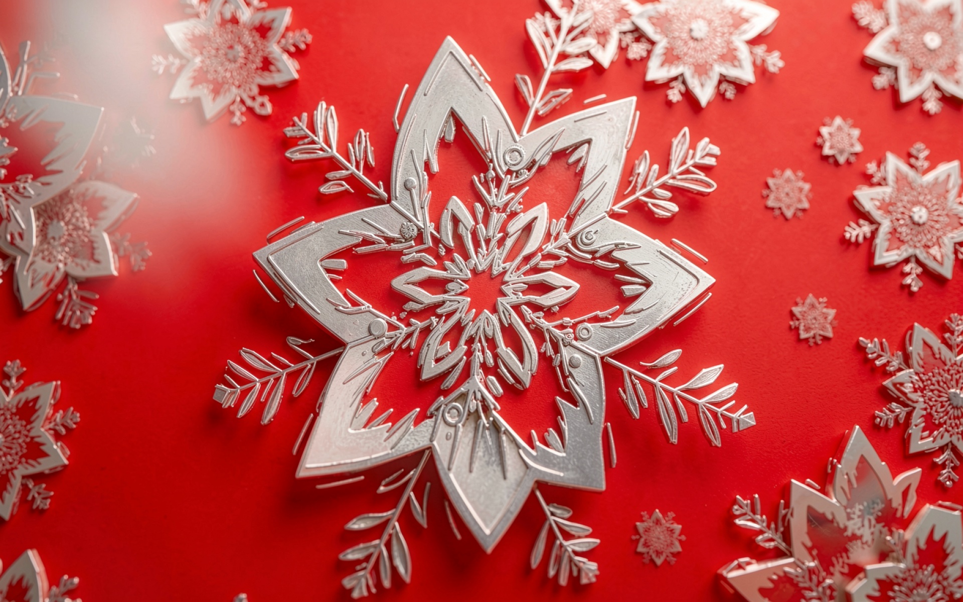 Серебряная снежинка на ярко красном фоне