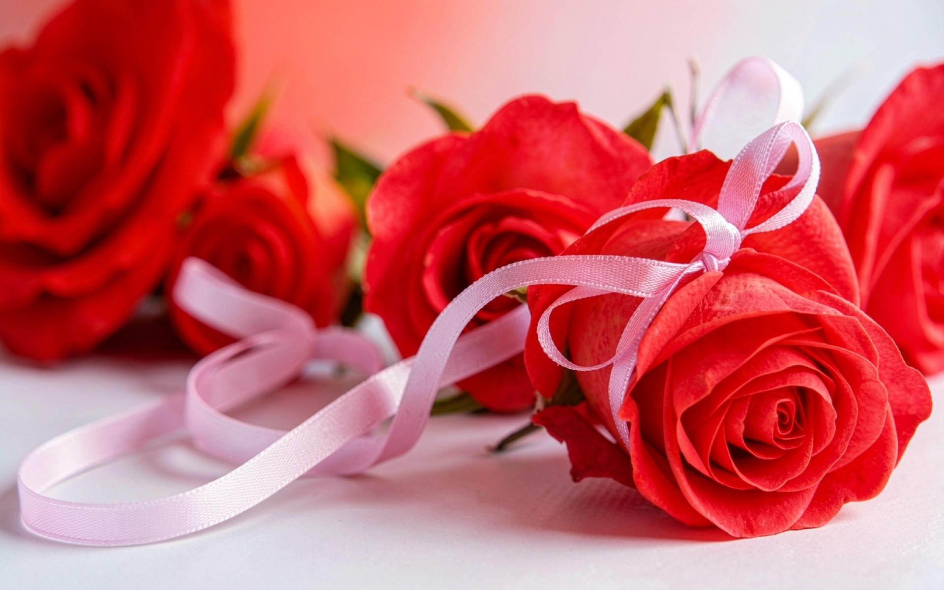 Красные розы с розовой лентой на белом фоне