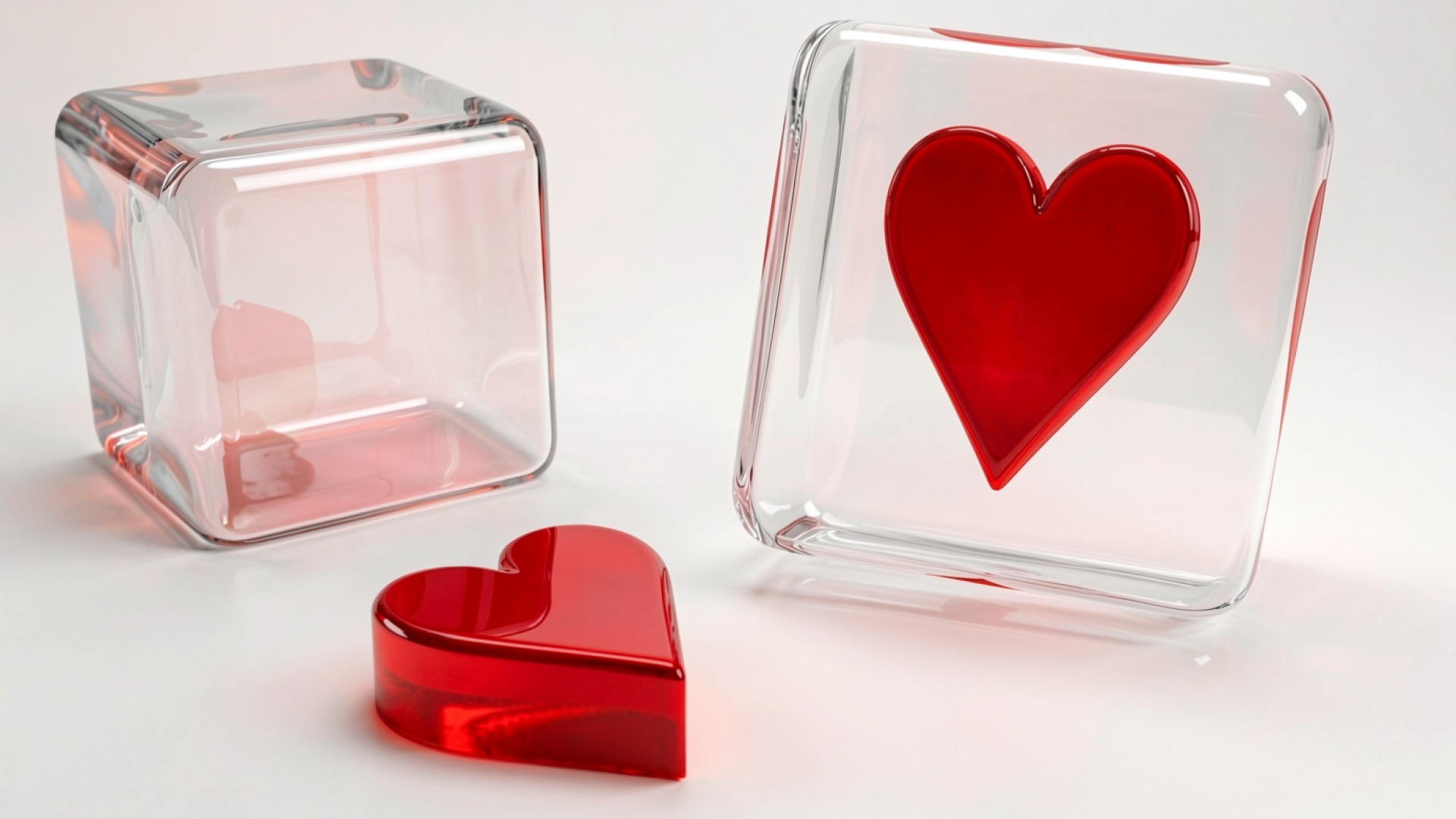 Красные стеклянные сердца в прозрачных кубах