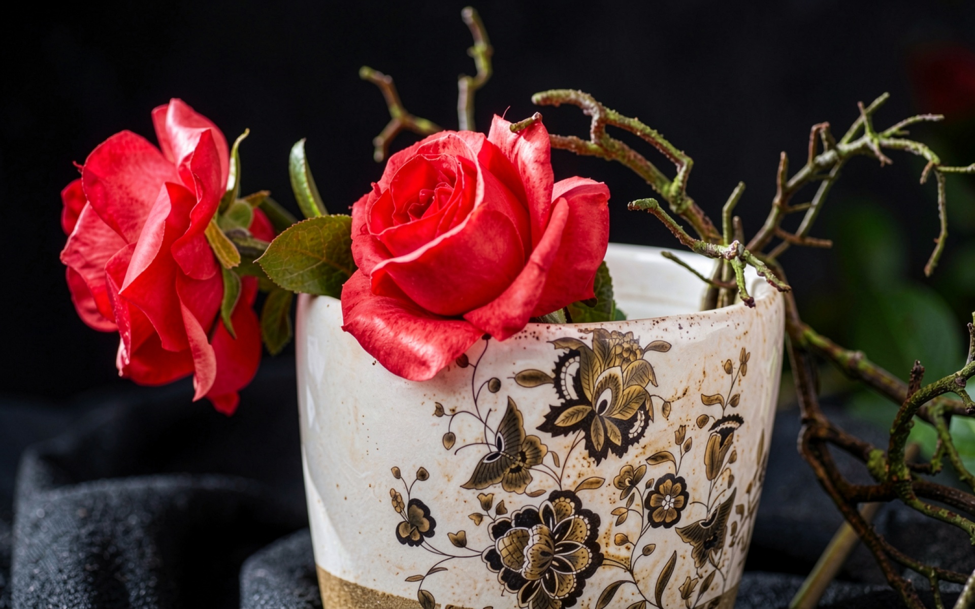 Красные розы в керамической вазе с узорами