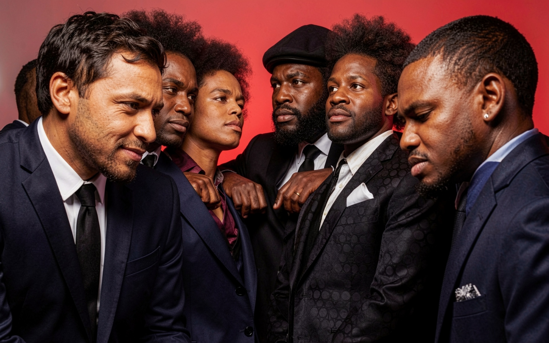 Группа мужчин в темных костюмах красный фон