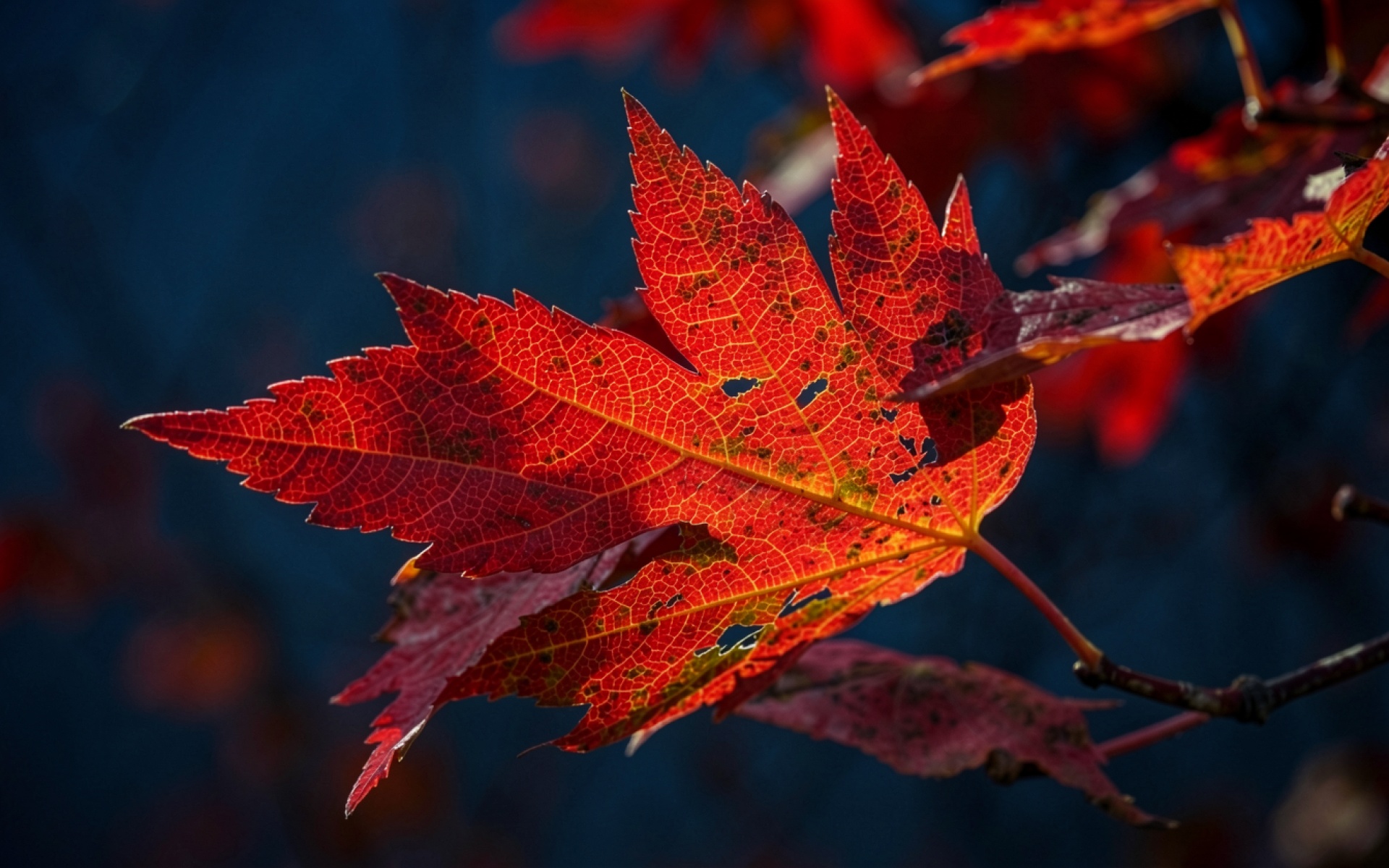 Красный осенний лист клена на темном фоне