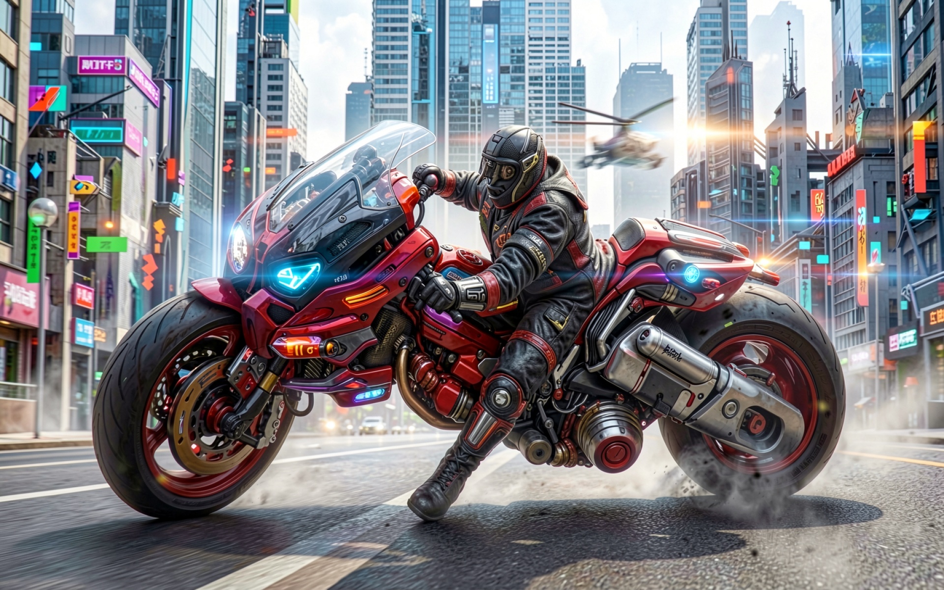 Красный футуристичный мотоцикл в неоновом киберпанке
