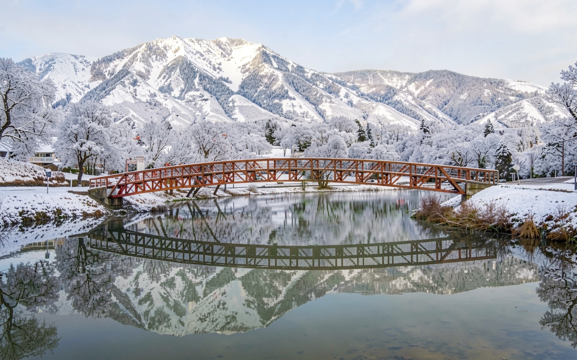 Красный деревянный мост в заснеженном зимнем пейзаже