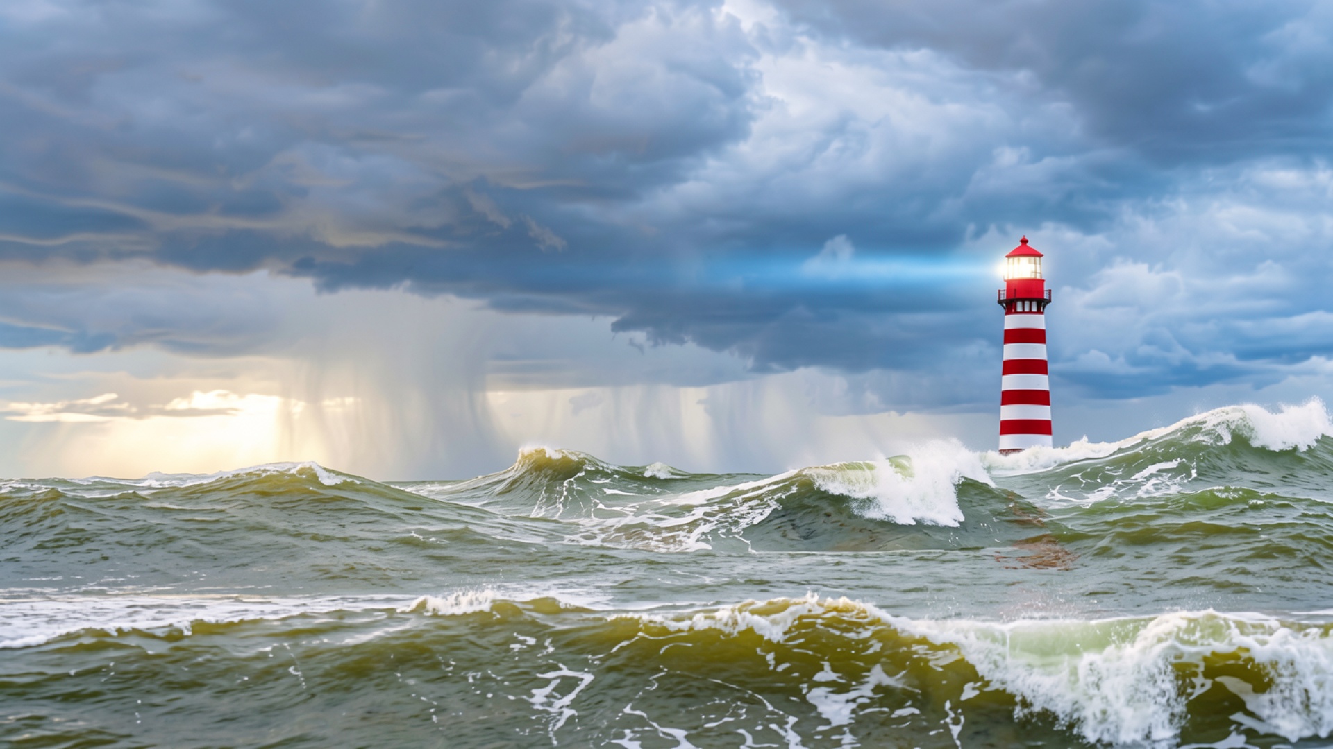 Красный полосатый маяк в штормовом океане