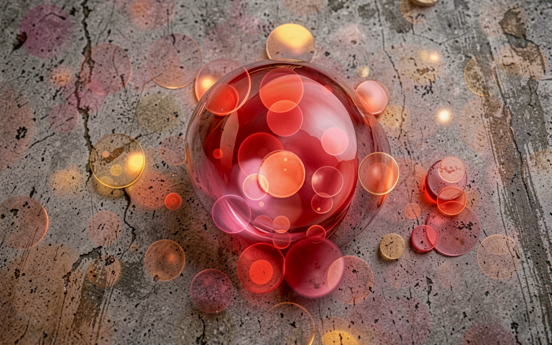 Красный стеклянный шар на сером бетонном фоне