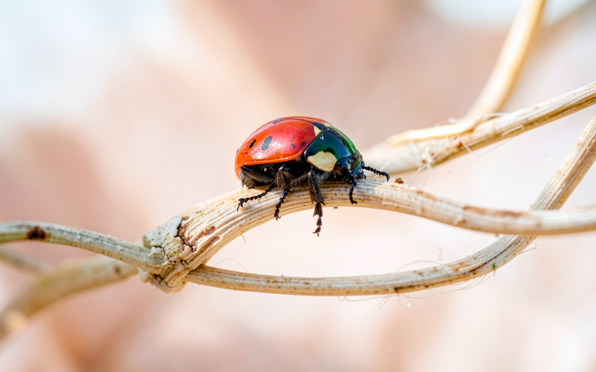 Красный жук на сухой ветке растения