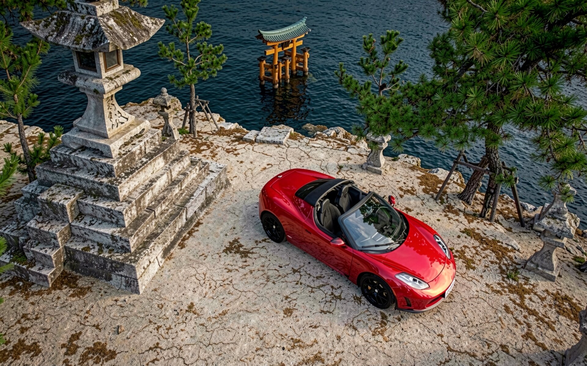 Красный спортивный автомобиль в японском саду