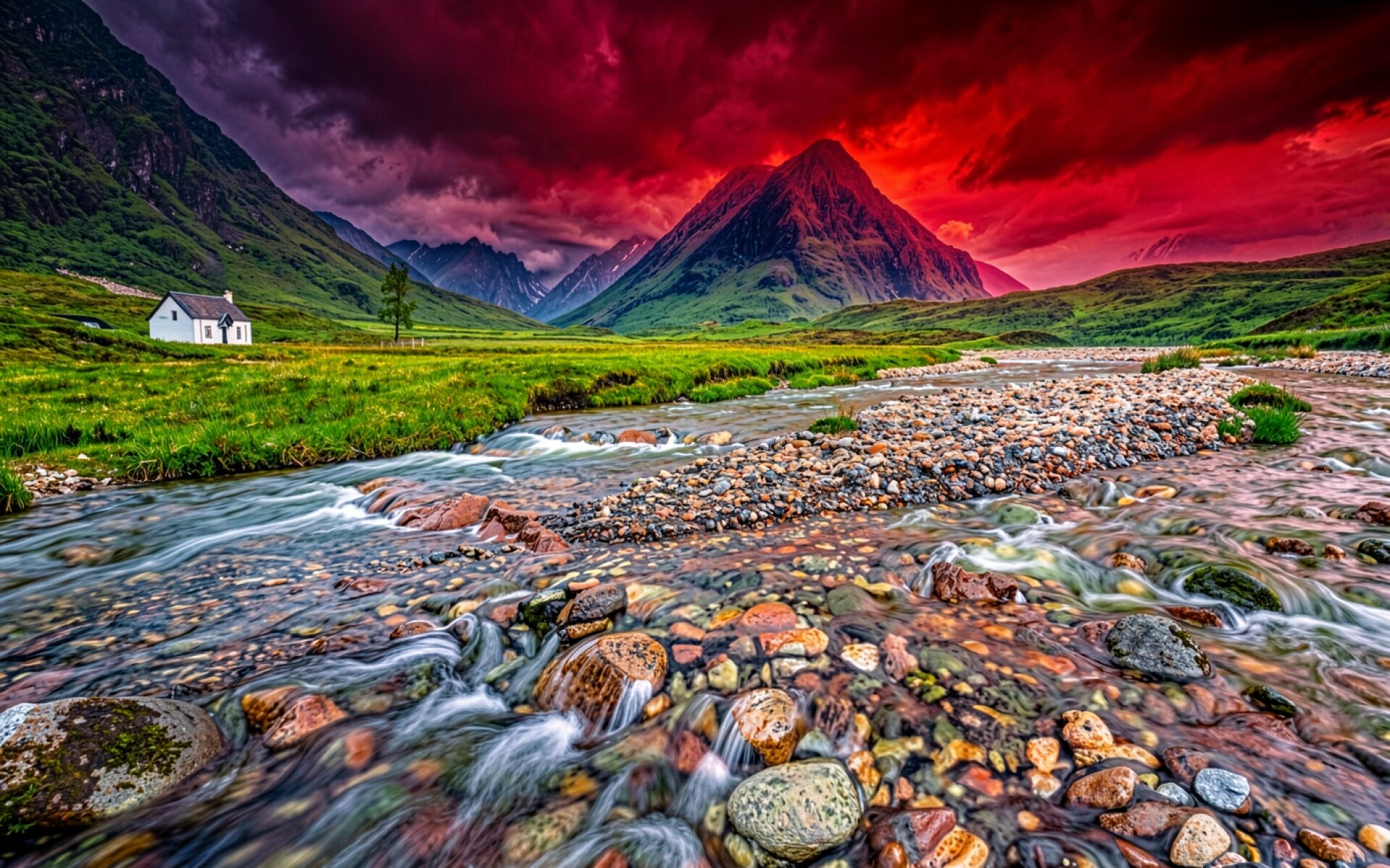 Горный пейзаж с красным небом и рекой