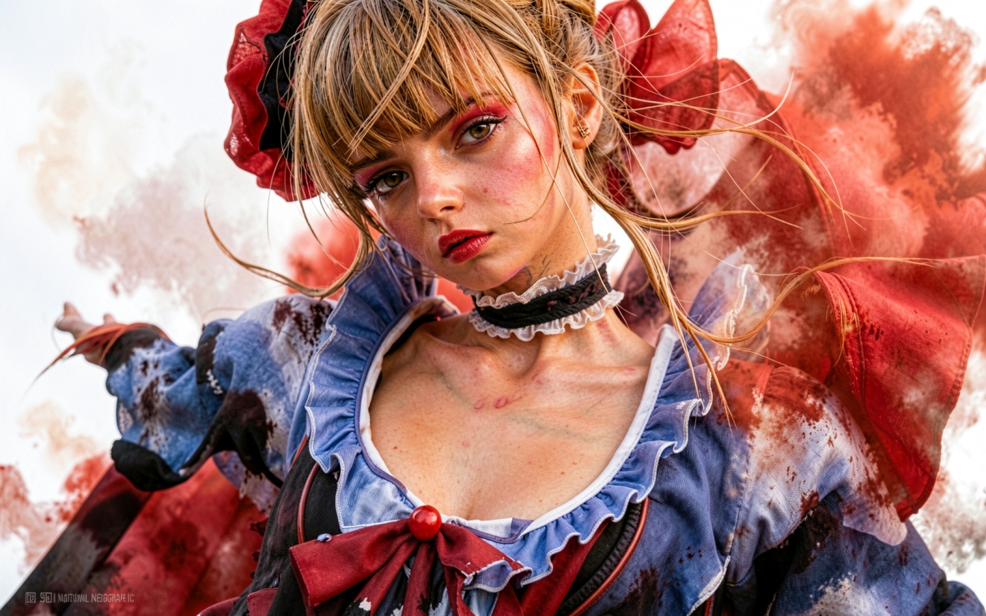 Девушка в синем платье с красным дымом