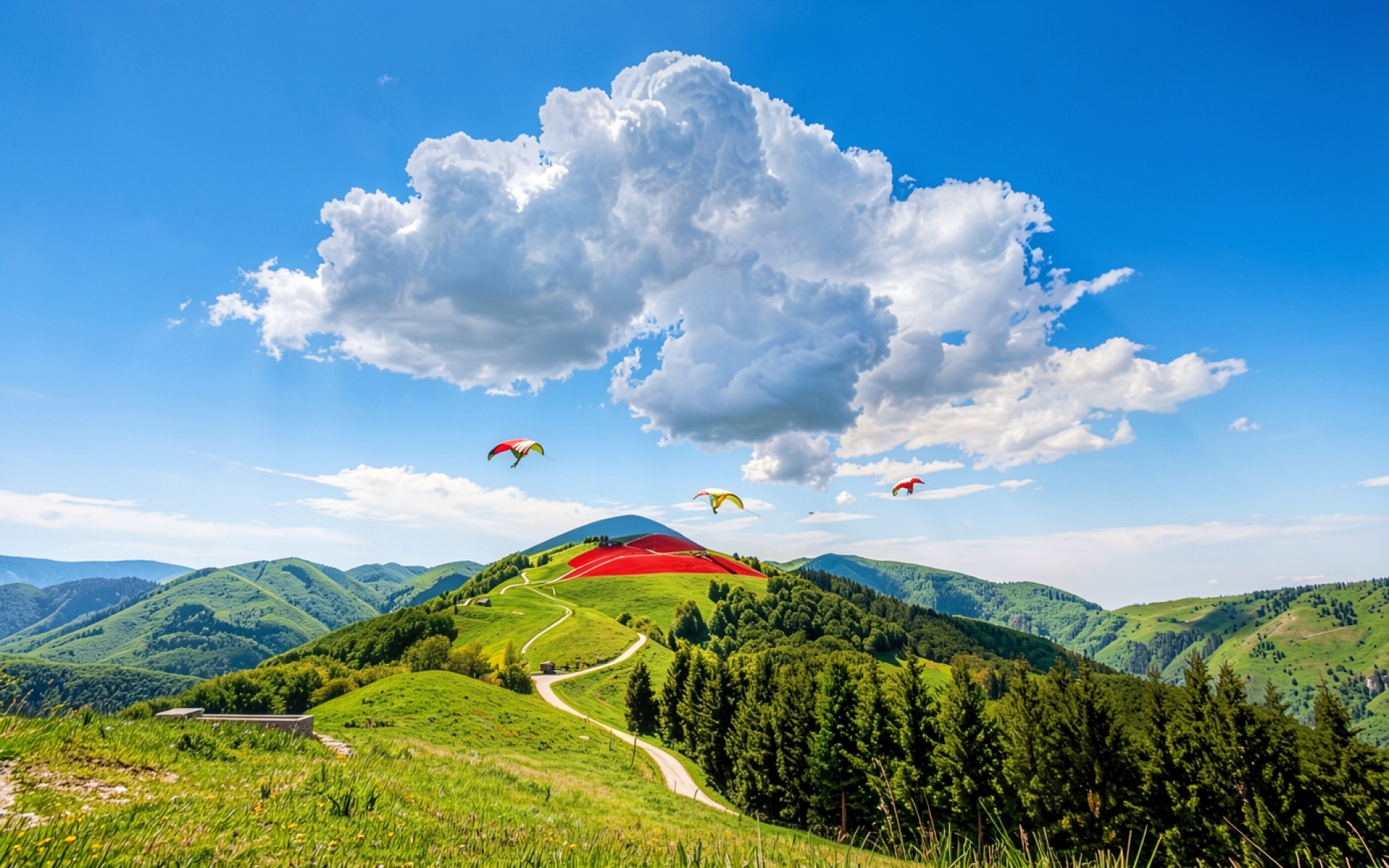 Парапланы над зелеными холмами с красным куполом