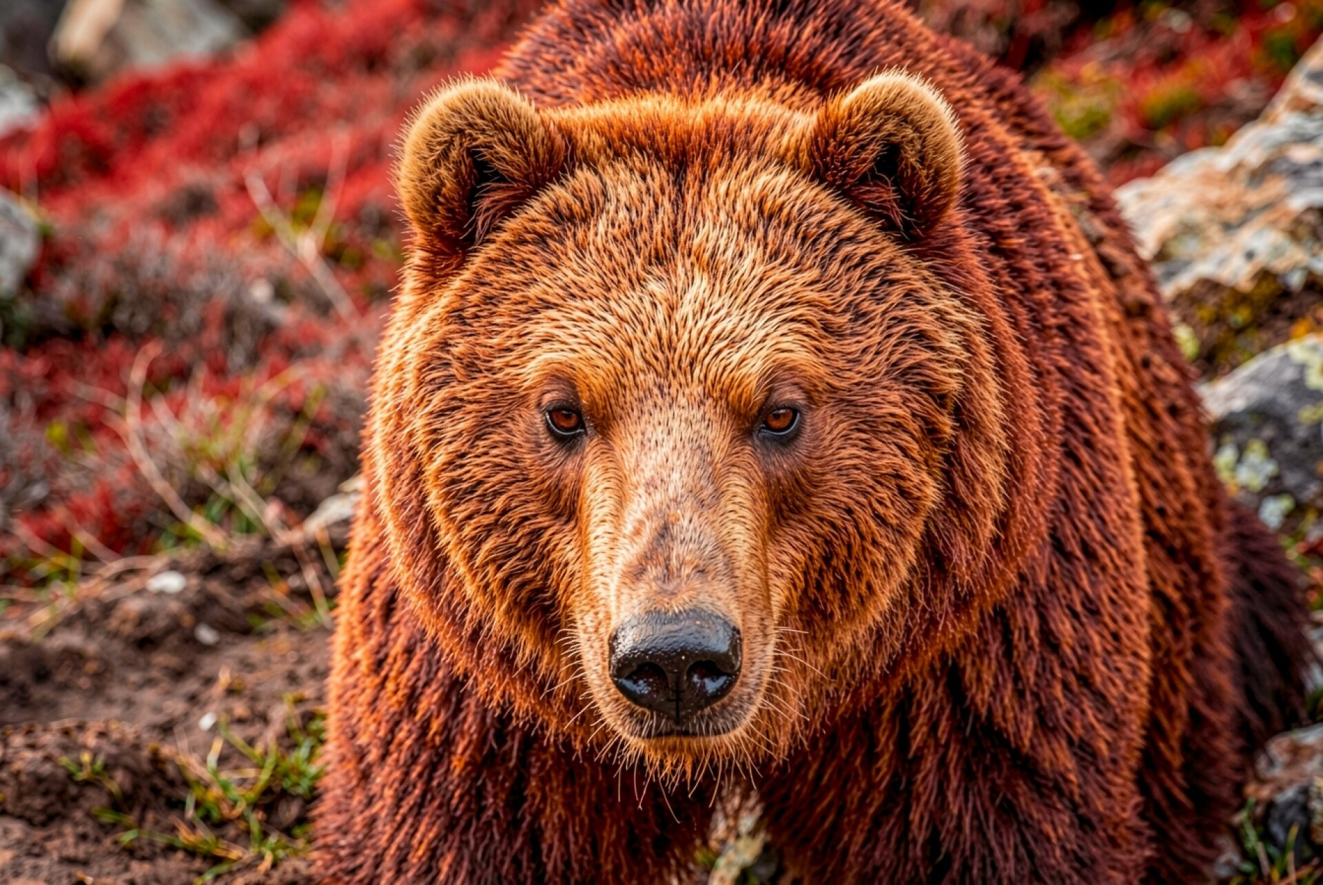Бурый медведь в осеннем лесу с красным кустарником
