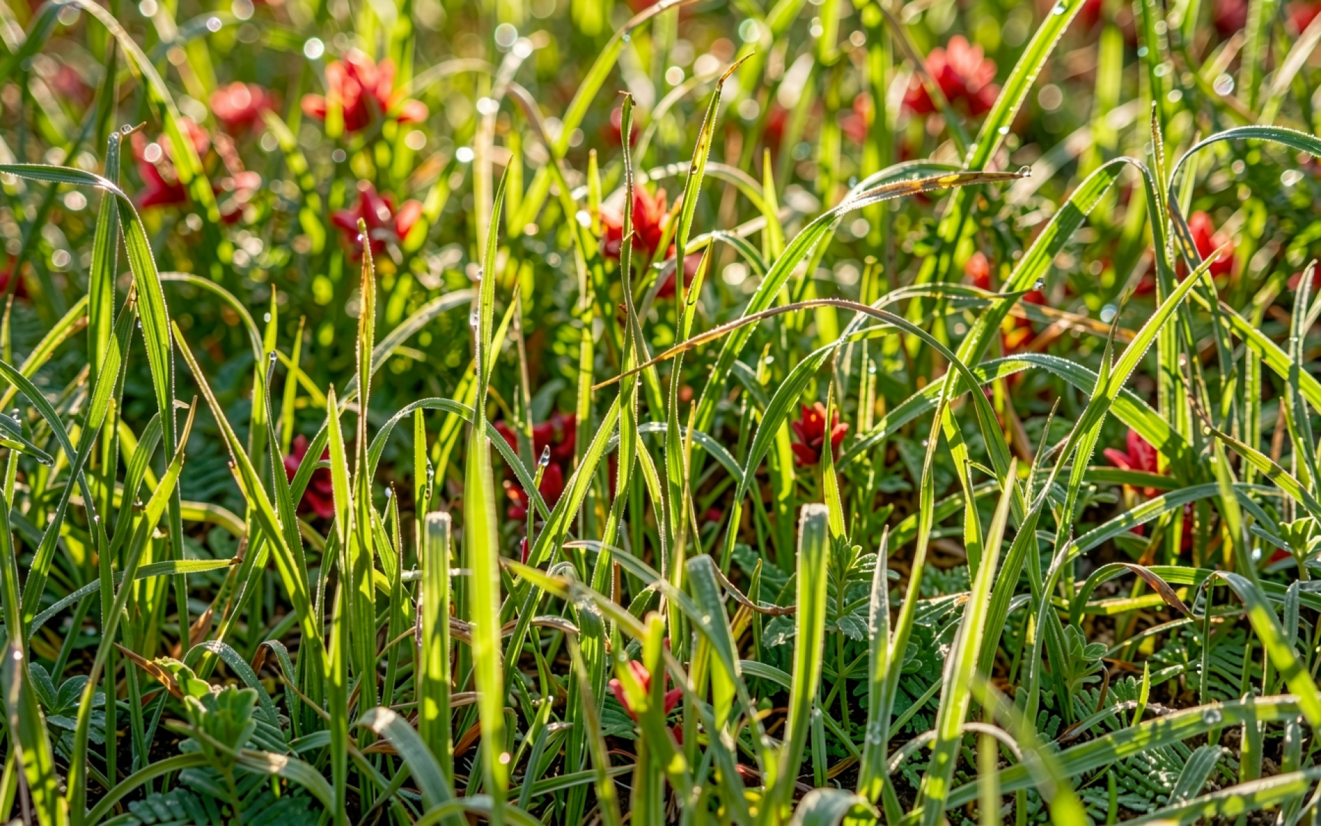 Зеленая трава с каплями росы и красными цветами
