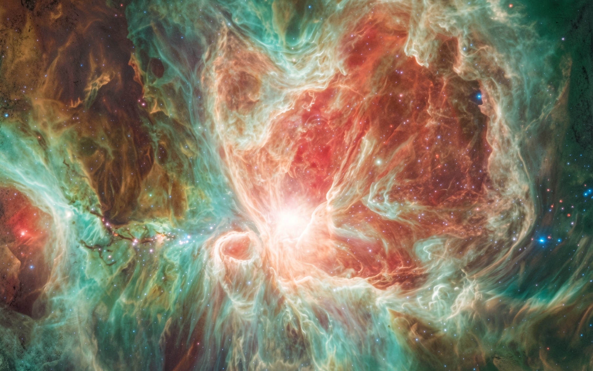 Космическая туманность красных и бирюзовых оттенков