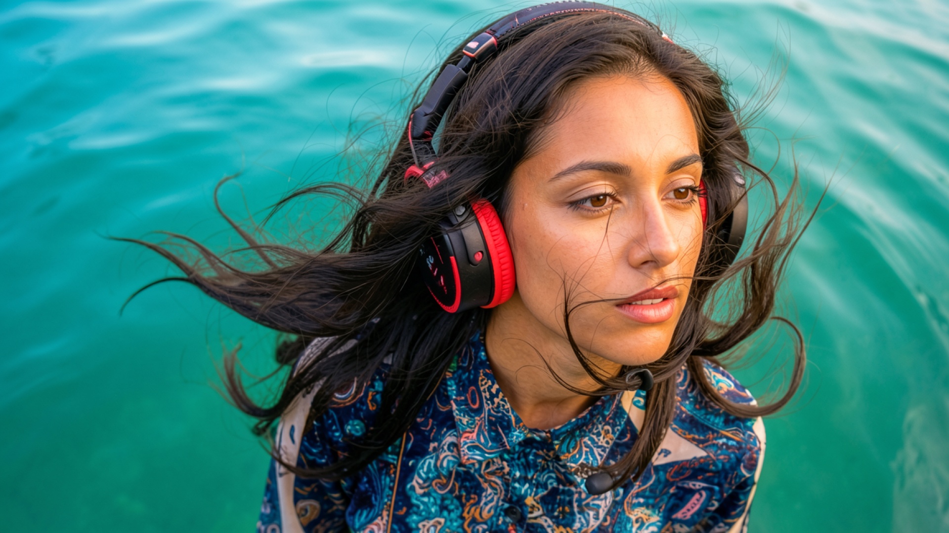 Девушка в красных наушниках на фоне бирюзовой воды