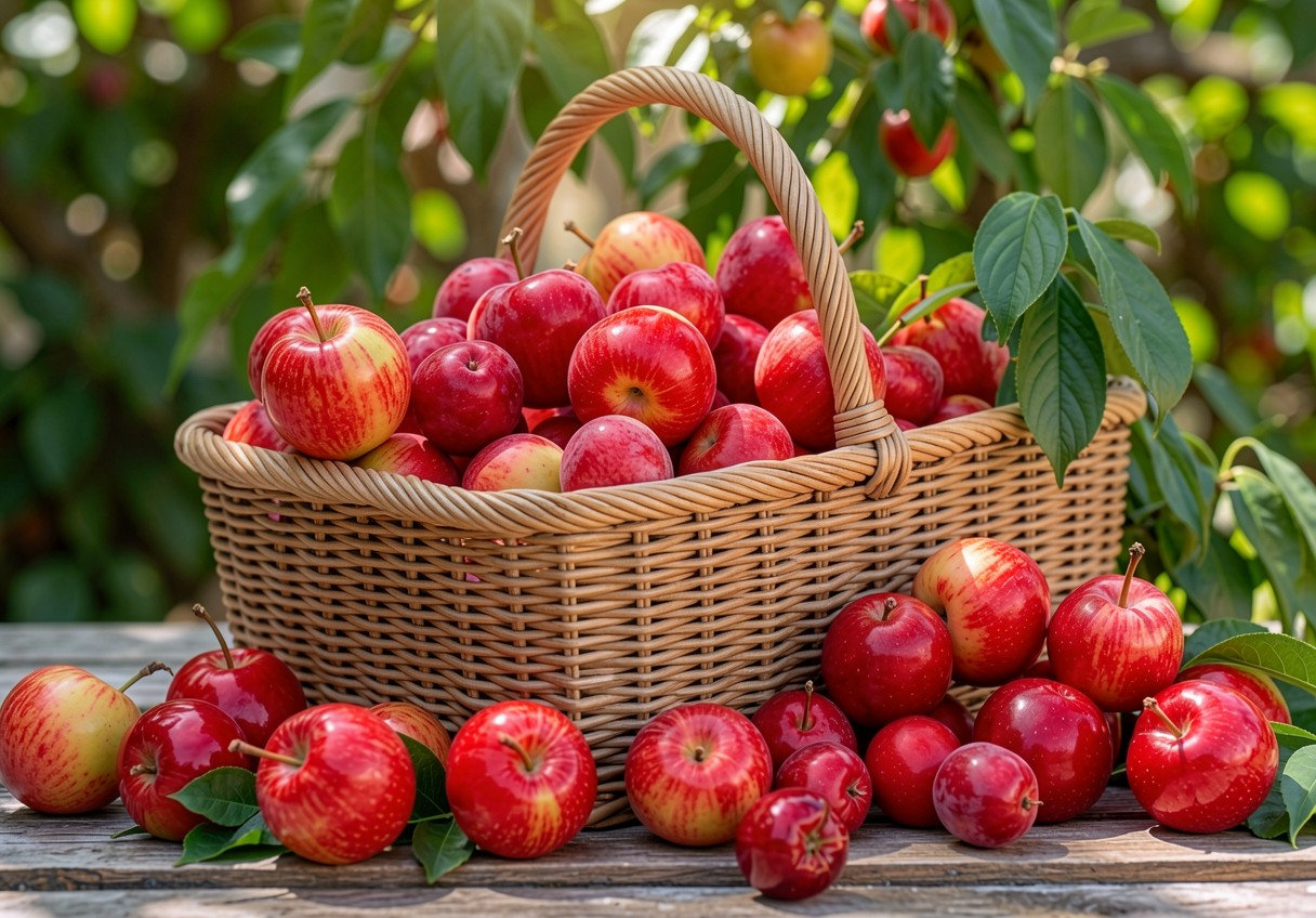 Корзина красных яблок в солнечном саду