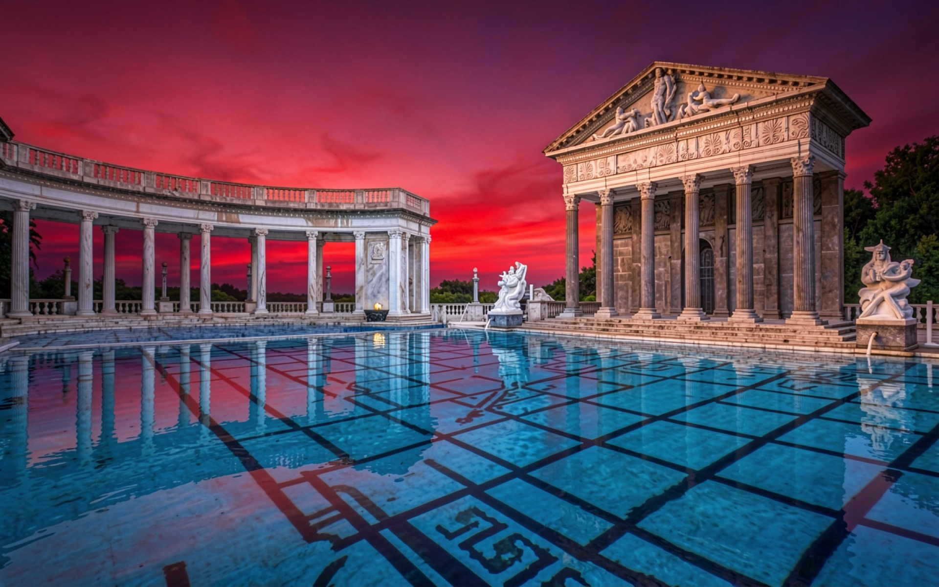 Античный храм с бассейном в красных сумерках