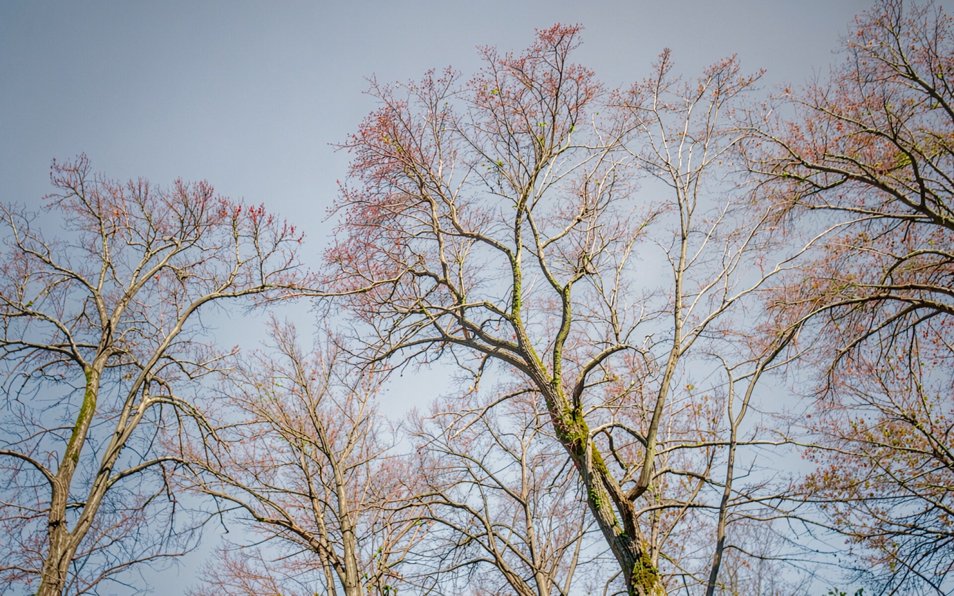 Кроны деревьев с красными почками осенью