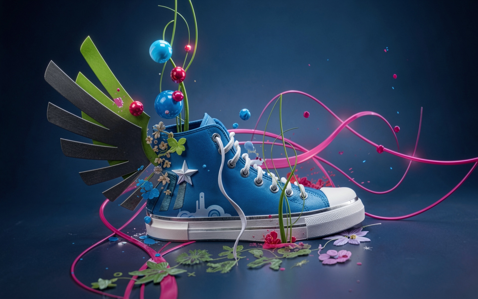 Синий кроссовок с крыльями в сюрреалистичном пространстве