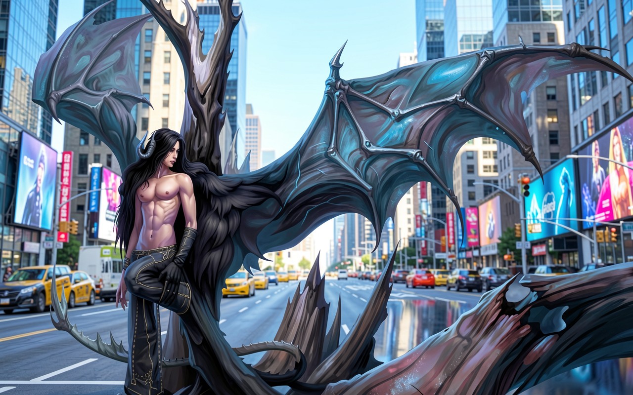 Демон с черными крыльями на улице Нью-Йорка