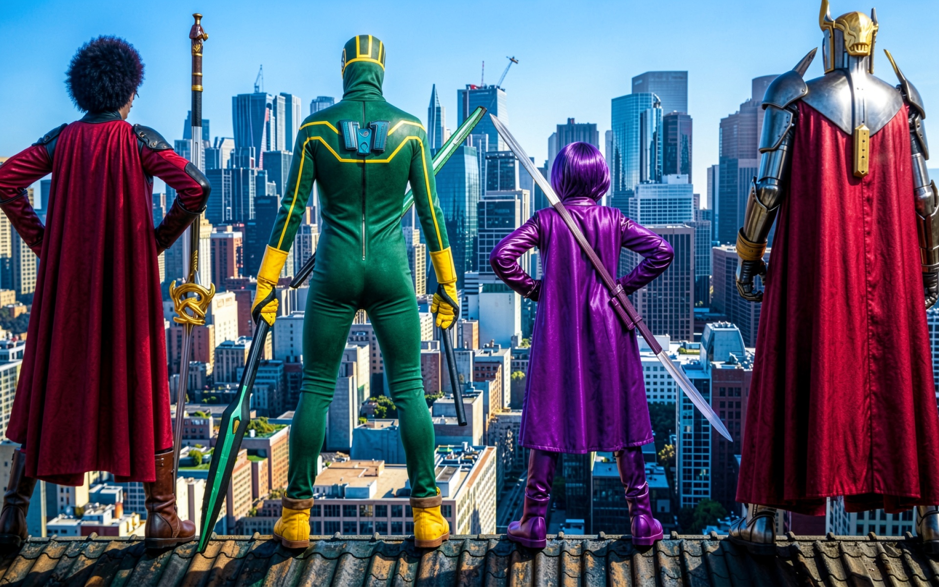 Команда супергероев на крыше современного города